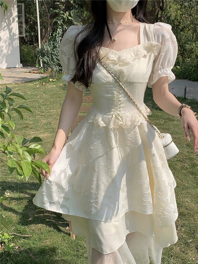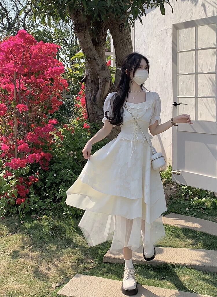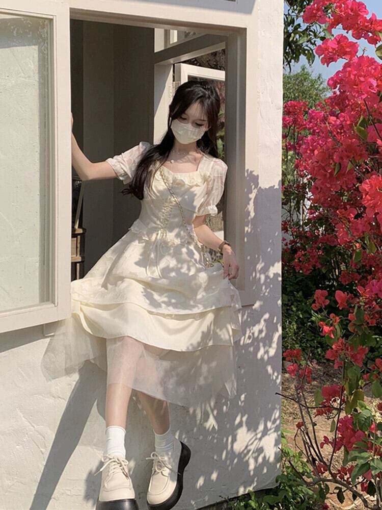 スクエアカラー半袖ドレスの女性の 2023 夏の新しいフレンチセレブスタイルウエストスリムデザインプリンセススカート サマー 夏物 スクウェア missk28013846457