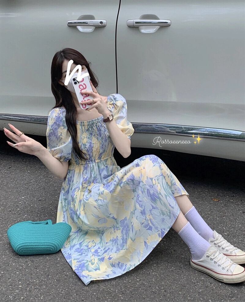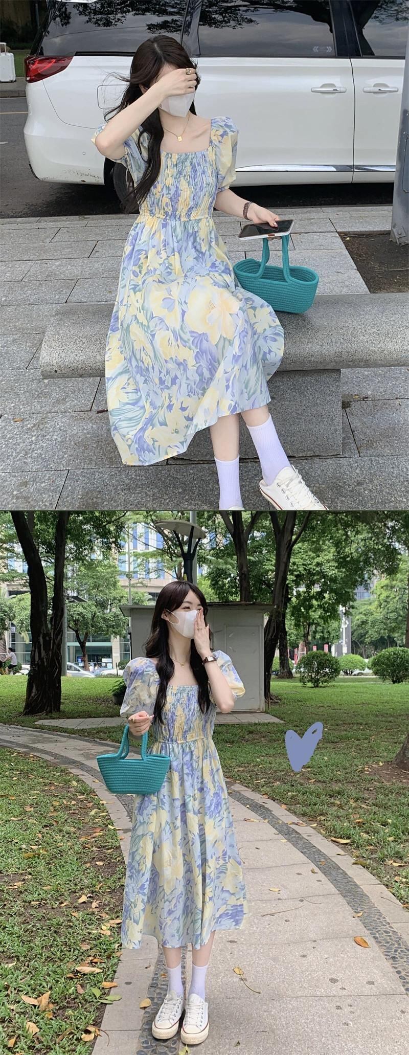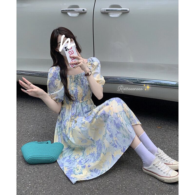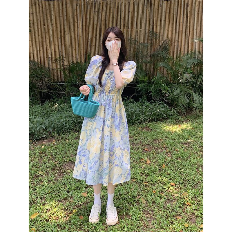 夏 2023 スクエアネックひだスマッジプリントパフスリーブミッドレングスウエスタンスタイル半袖ドレス女性 サマー 夏物 スクウェア missk29961751685