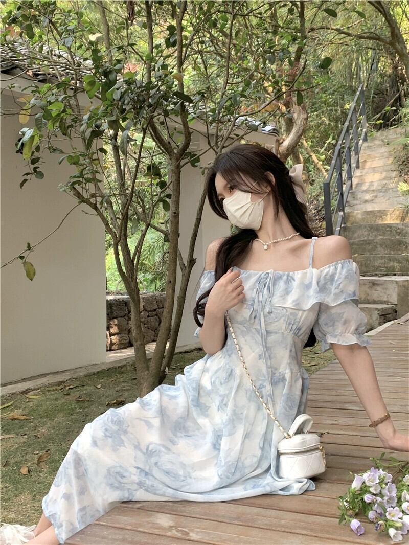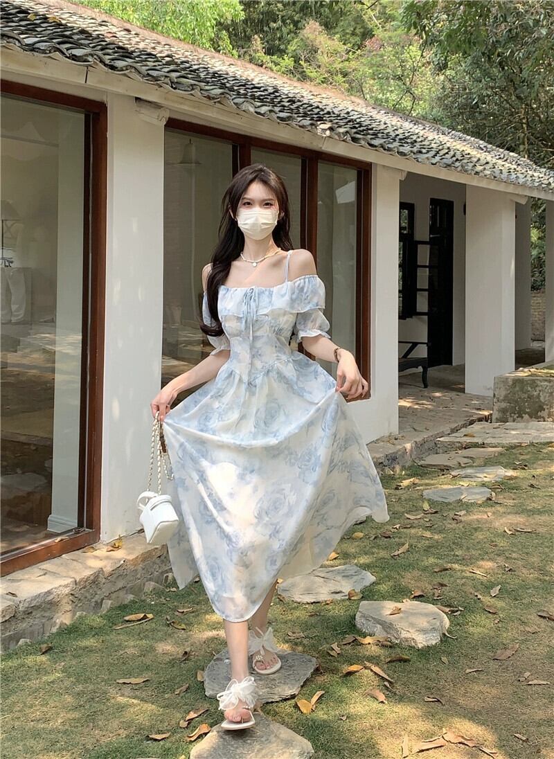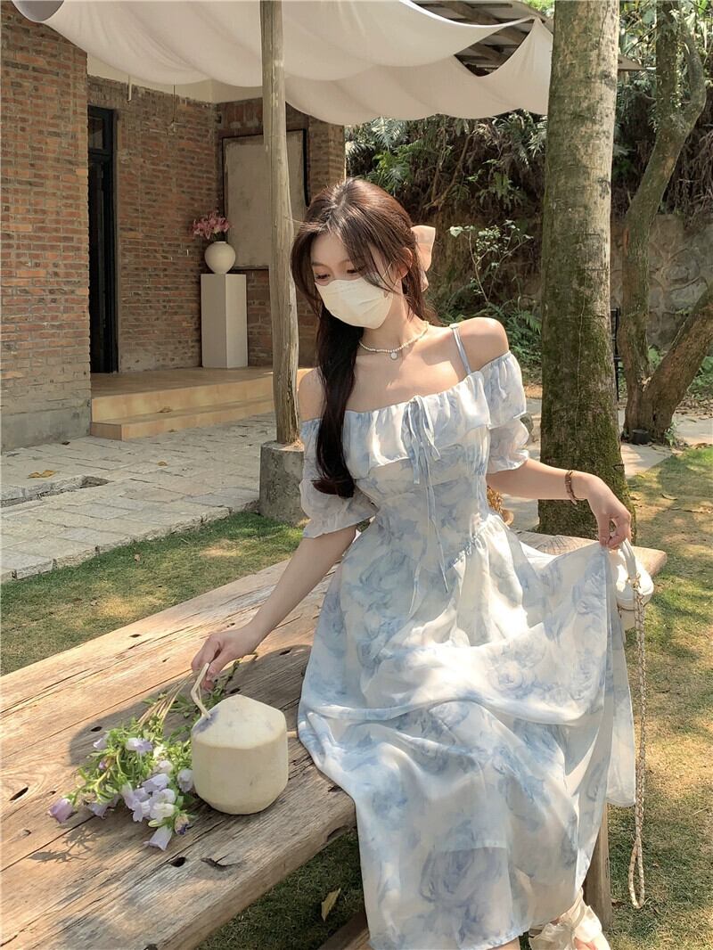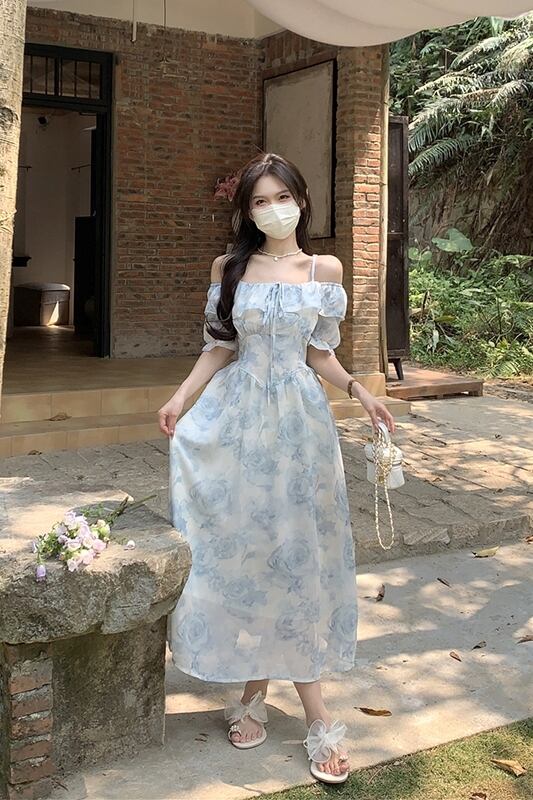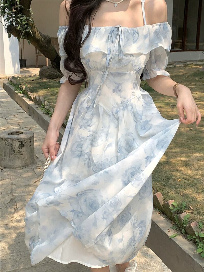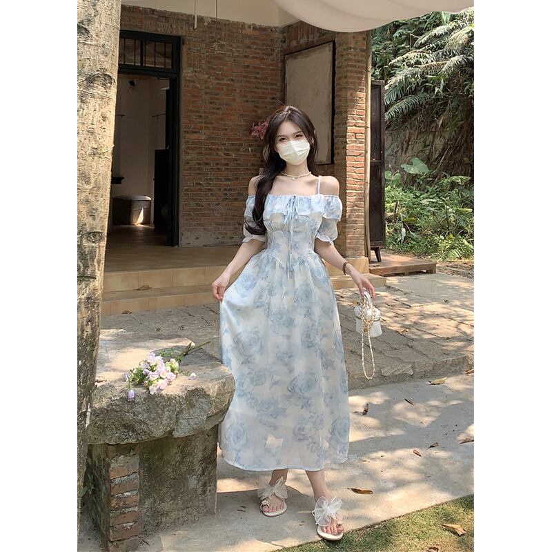 フレンチスリング半袖ドレスの女性の夏の2023新しいウエストラインスリムワンショルダー気質花柄ティーブレイクスカート サマー 夏物 missk35263116066