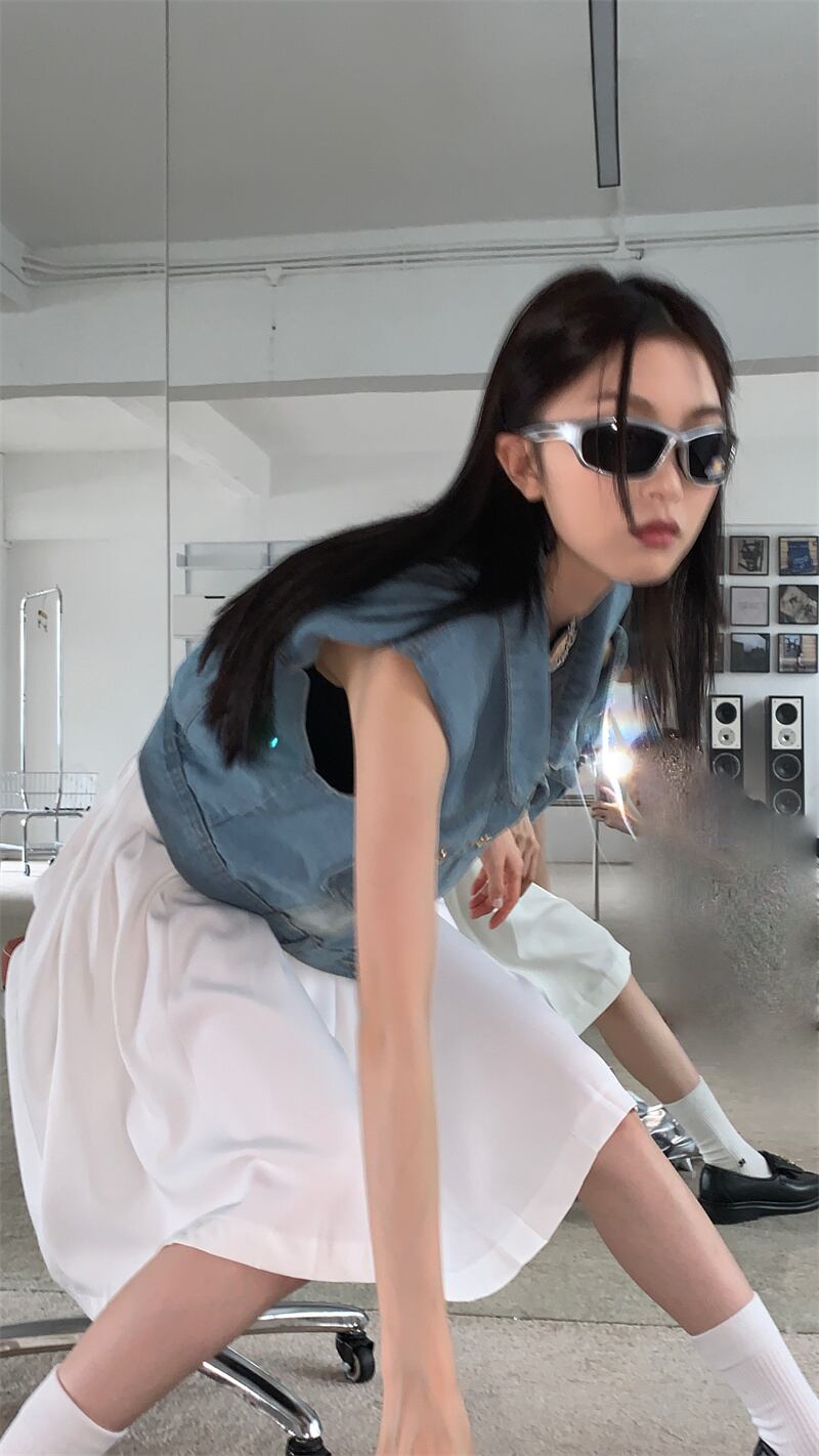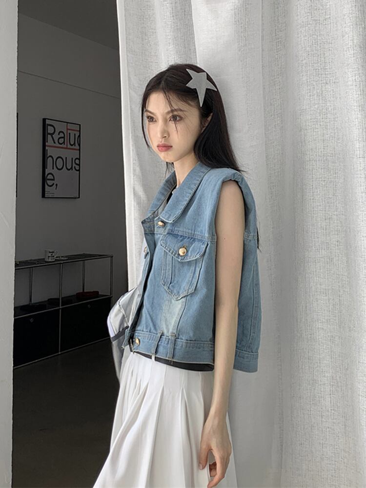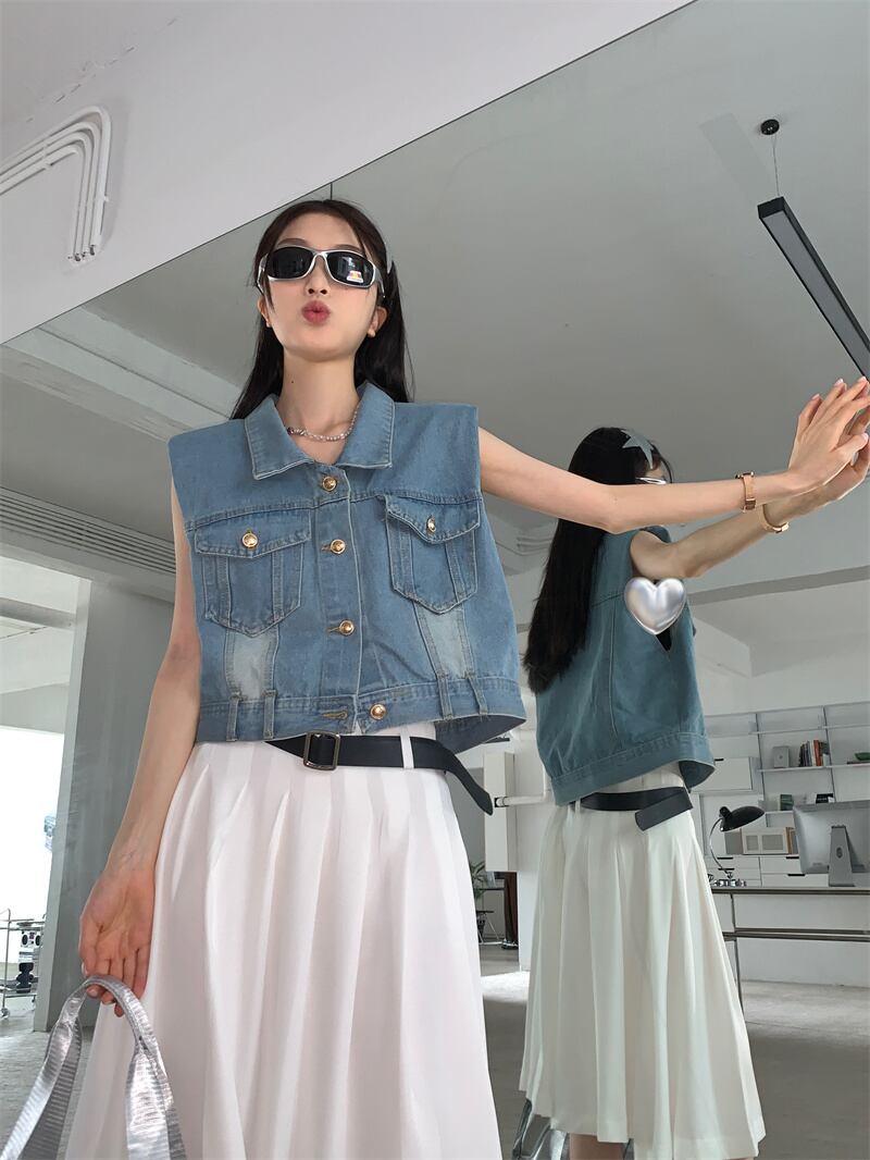 2023 夏の新スタイルのファッションルーズオールマッチデザインセンスシングルブレストブルーデニムベストジャケット婦人服 サマー 夏物 missk7542621690