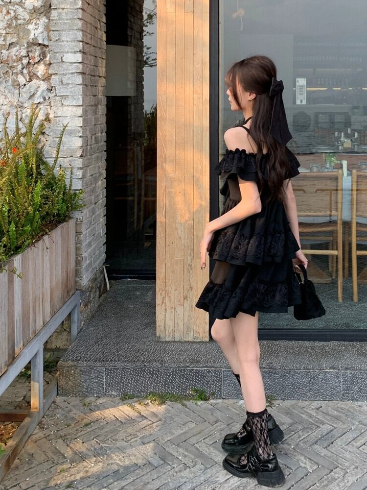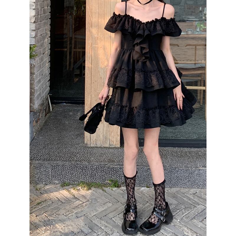 レトロ黒レースサスペンダードレスレディース 2023 夏の新デザインウエストスリムデザイン感 A ラインチュチュスカート ブラック サマー 夏物 Aライン パニエ ペチコート missk62958079587