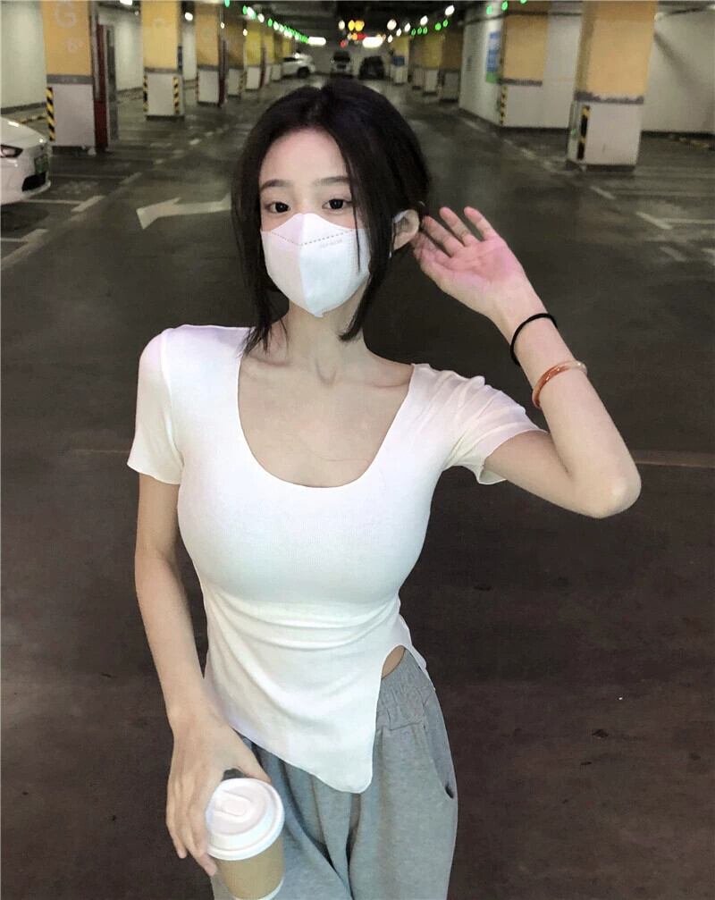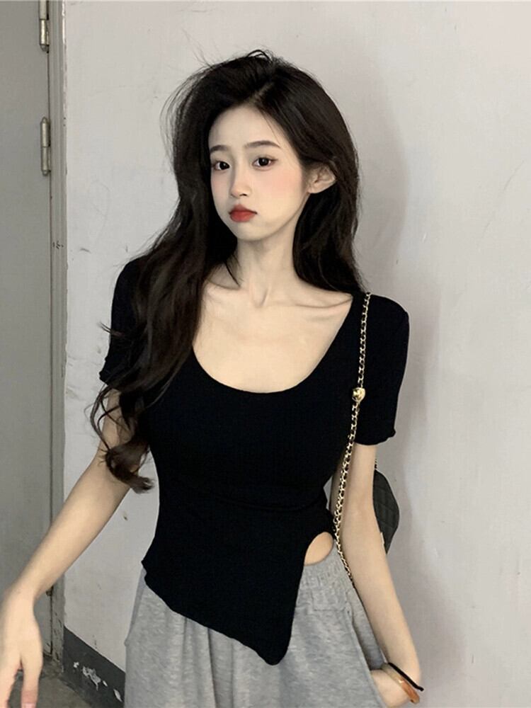 低ラウンドネック半袖 T シャツの女性の夏バージョン 2023 新しい不規則なスリムな白い鎖骨トップ イン ホワイト サマー 夏物 Oネック Tシャツ missk10665428287