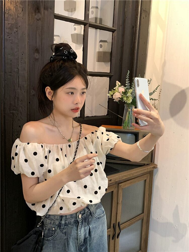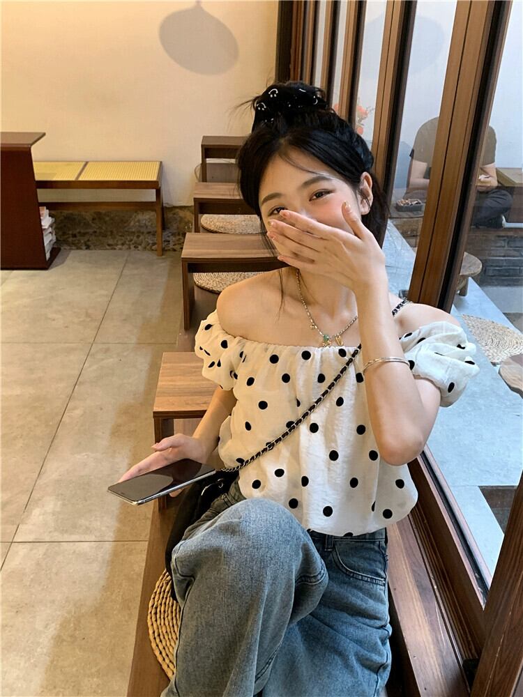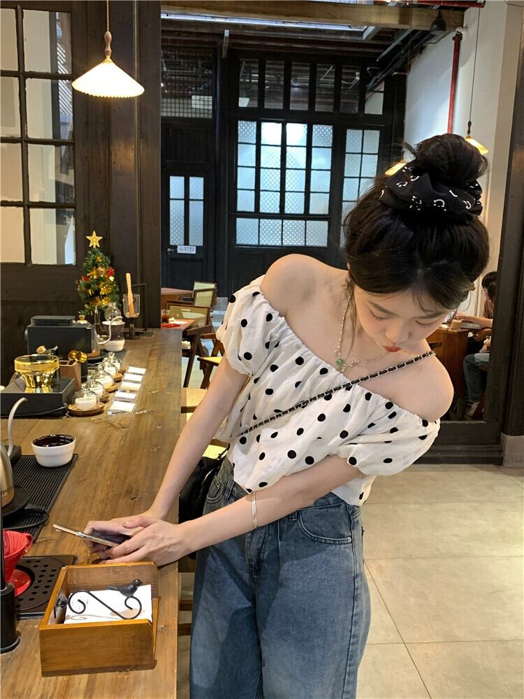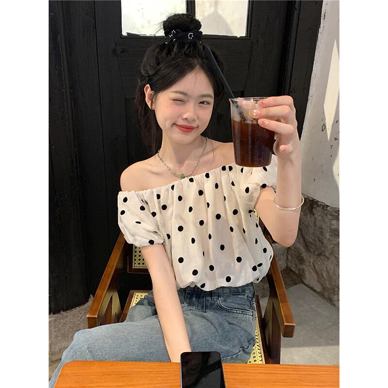 水玉半袖シャツレディース 2023 夏の新作ワンショルダー パフ スリーブ 甘いアウター ショート シック シャツ 大人ガーリー スウィート キュート カジュアル サマー 夏物 missk2754034360