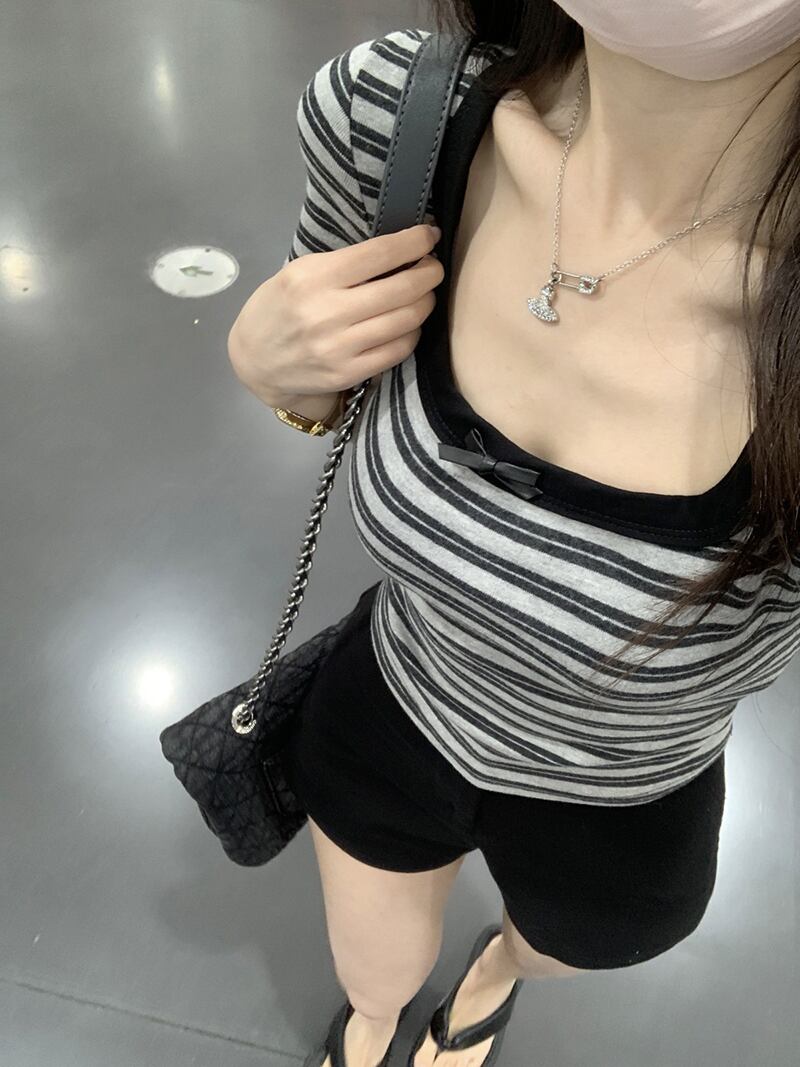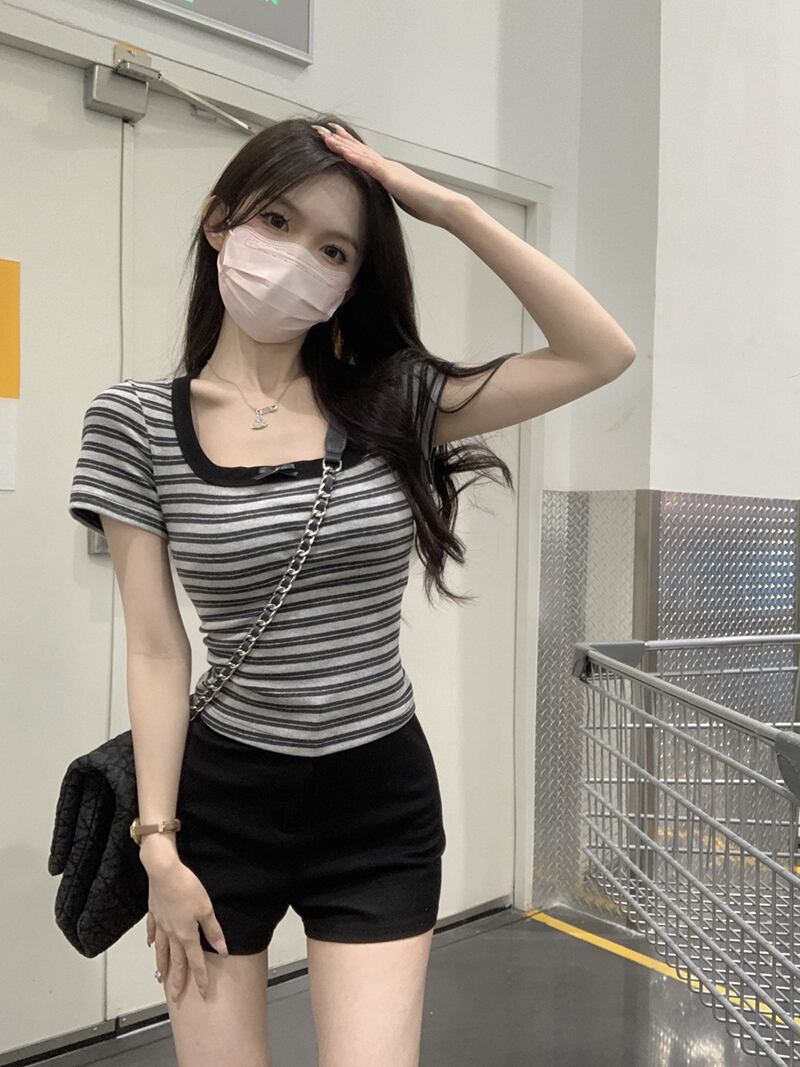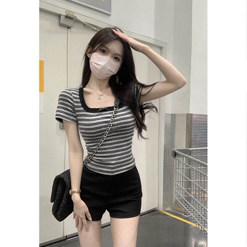 スクエアカラーフロントショルダー Tシャツレディース夏バージョン 2023 新しいコントラストカラーストライプスリムフィットショート半袖トップイン サマー 夏物 スクウェア missk92274286713