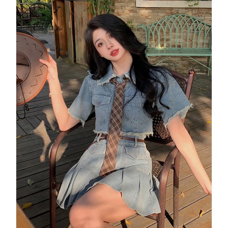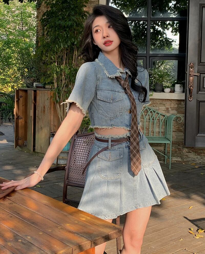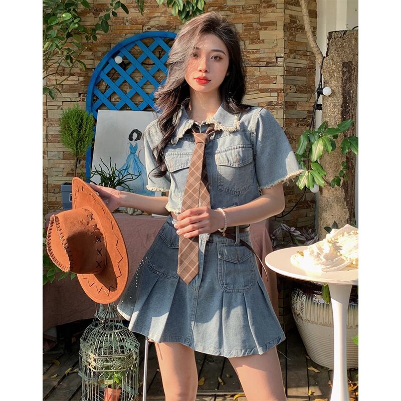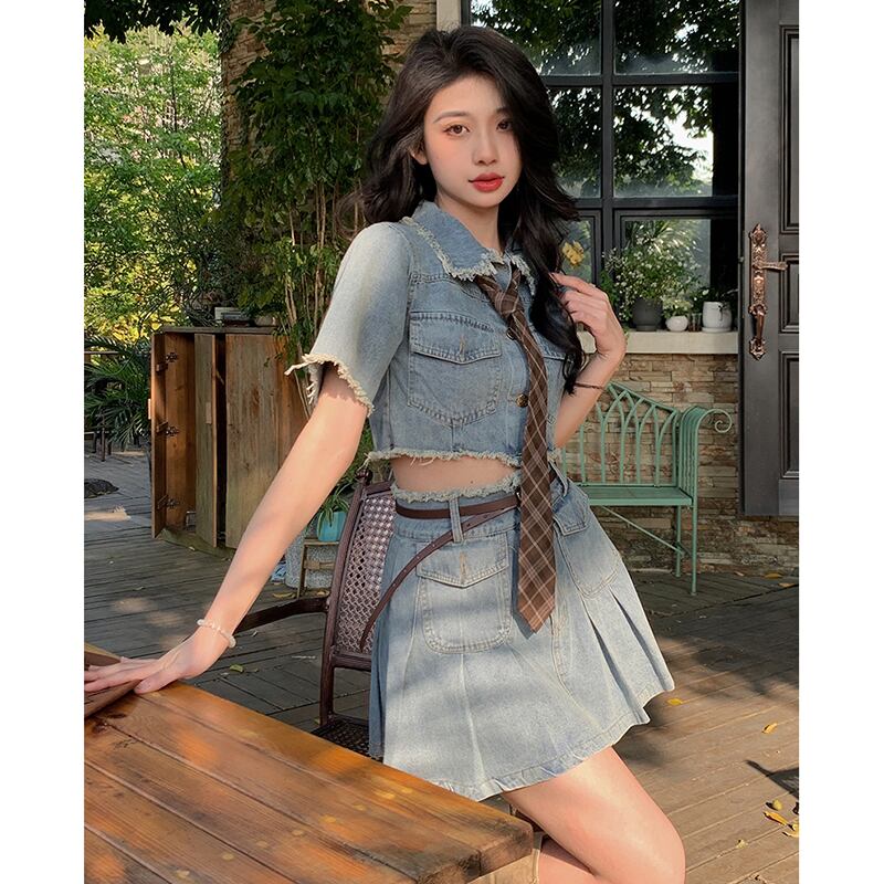 ラペルカラーローエッジショート半袖デニムジャケットプリーツスカート女性の夏の 2023 新しいファッションツーピーススーツ サマー 夏物 missk16355814016