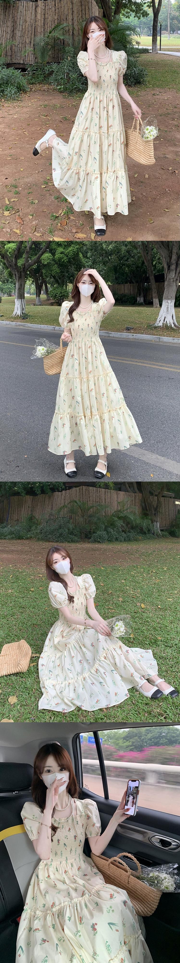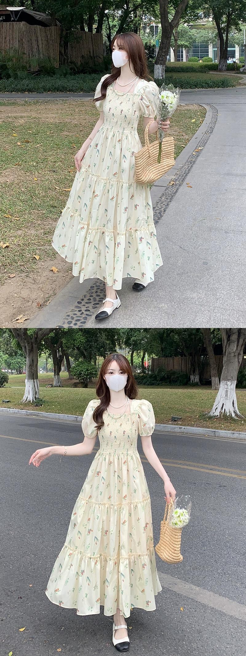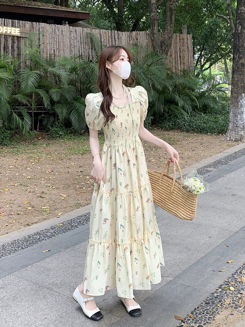フレンチスクエアカラードレスレディース2023夏新作パフスリーブウエスト痩身ミッドレングス花柄半袖スカート サマー 夏物 スクウェア missk65872415553