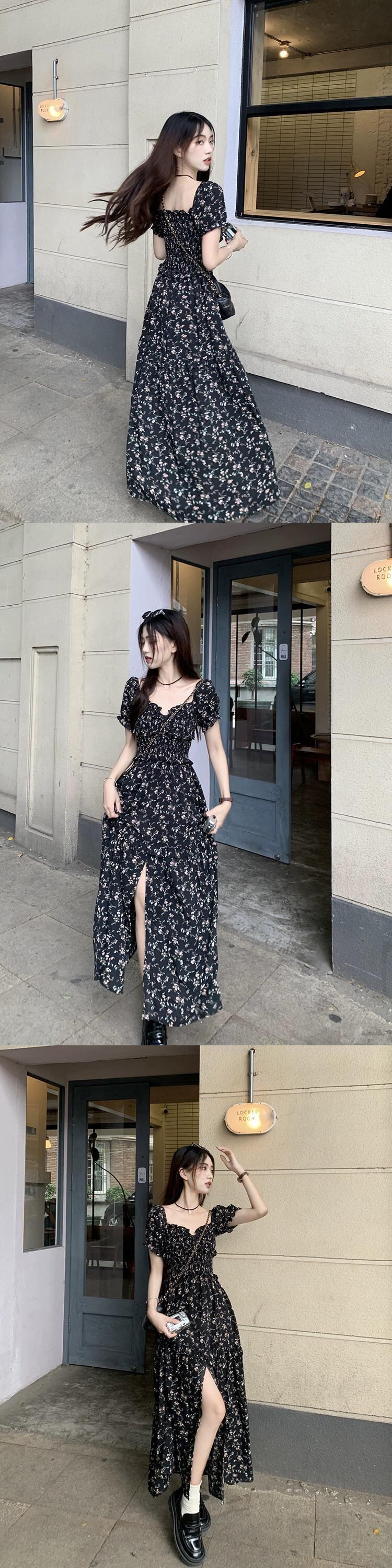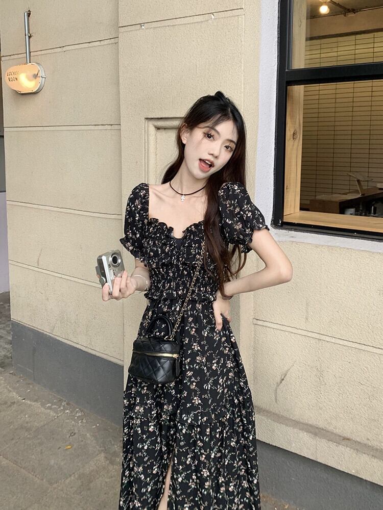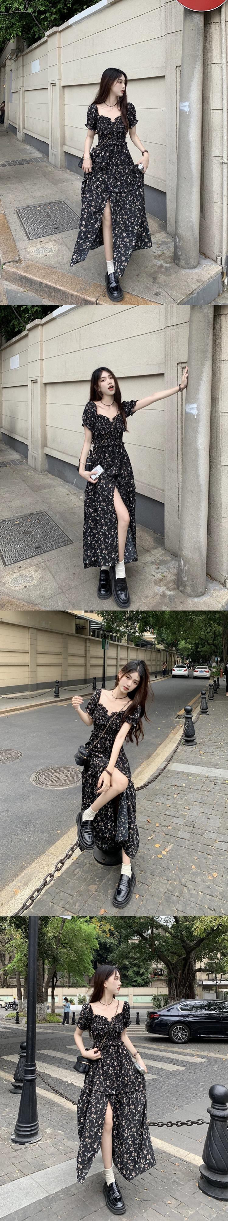 フレンチスクエアカラー花柄ワンピースレディース2023年夏新作ウエストミドル丈スリットAラインスカート サマー 夏物 スクウェア missk53608392999