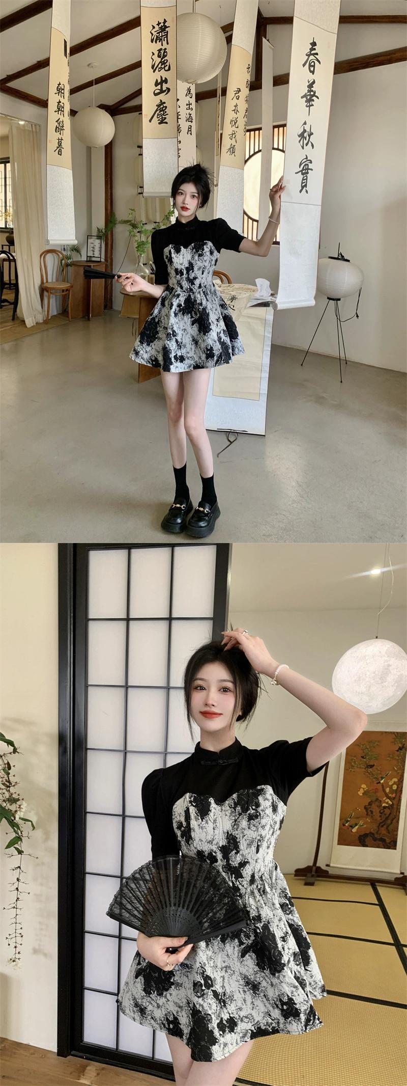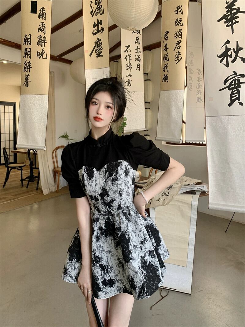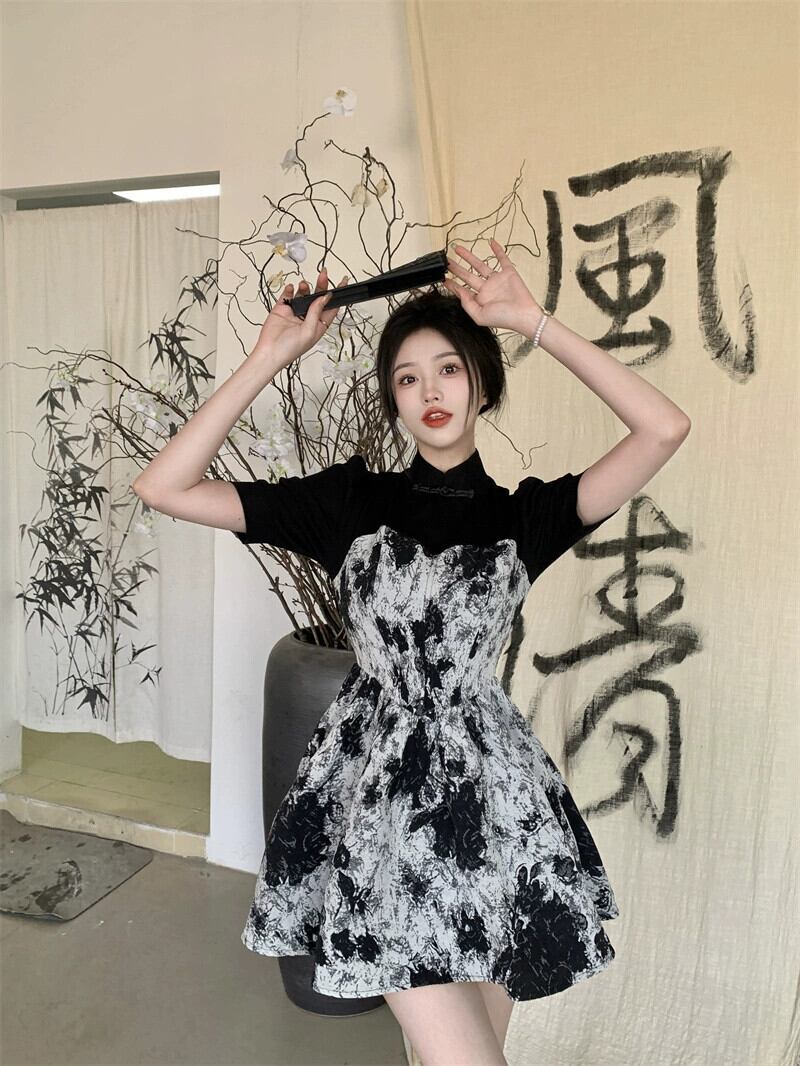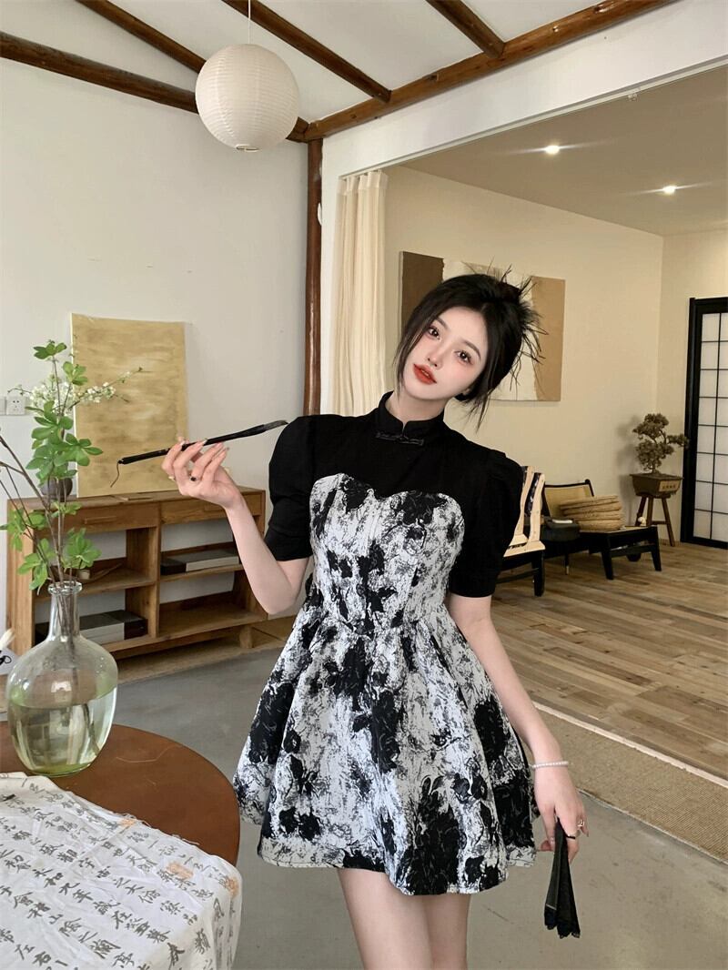レトロ水墨画ステッチ長袖ドレスの女性の夏の 2023 新しいデザインセンススタンドアップカラーウエスト半袖スカート ロング サマー 夏物 missk39932027247