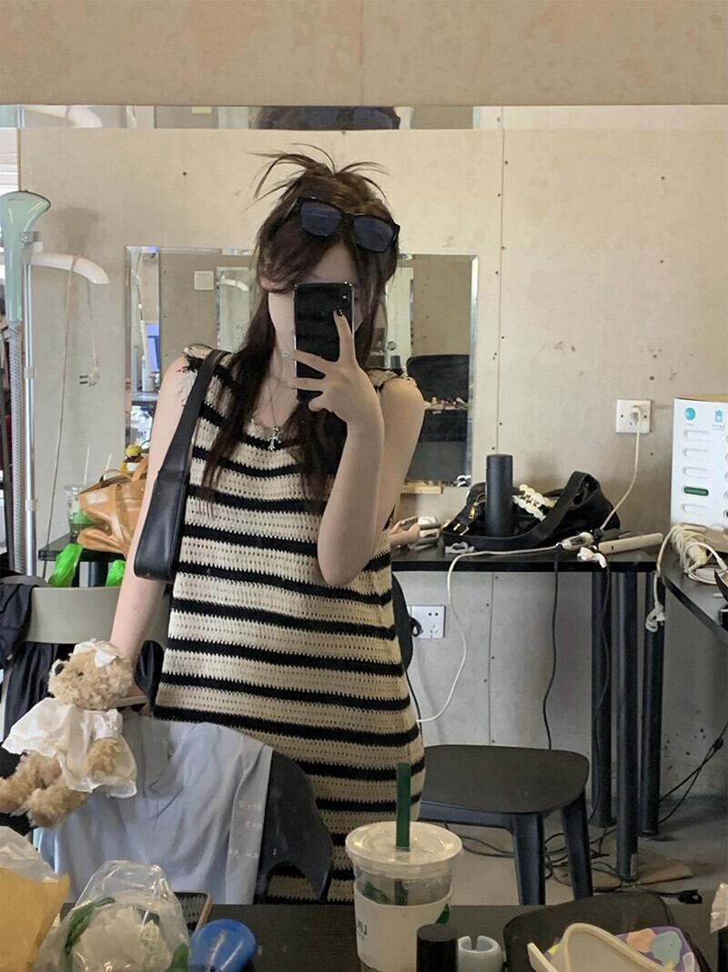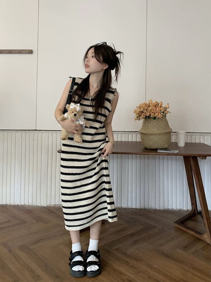 2023年夏新スタイルストレートホールデザインセンスハワイバケーションスタイルストライプベストドレス女性 サマー 夏物 missk68944925379