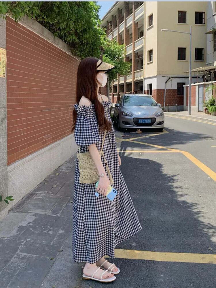 2023 夏の新しいファッションデザインセンスツーウェアワンショルダールーズチェック柄ロング半袖ドレスの女性 サマー 夏物 missk31112571118