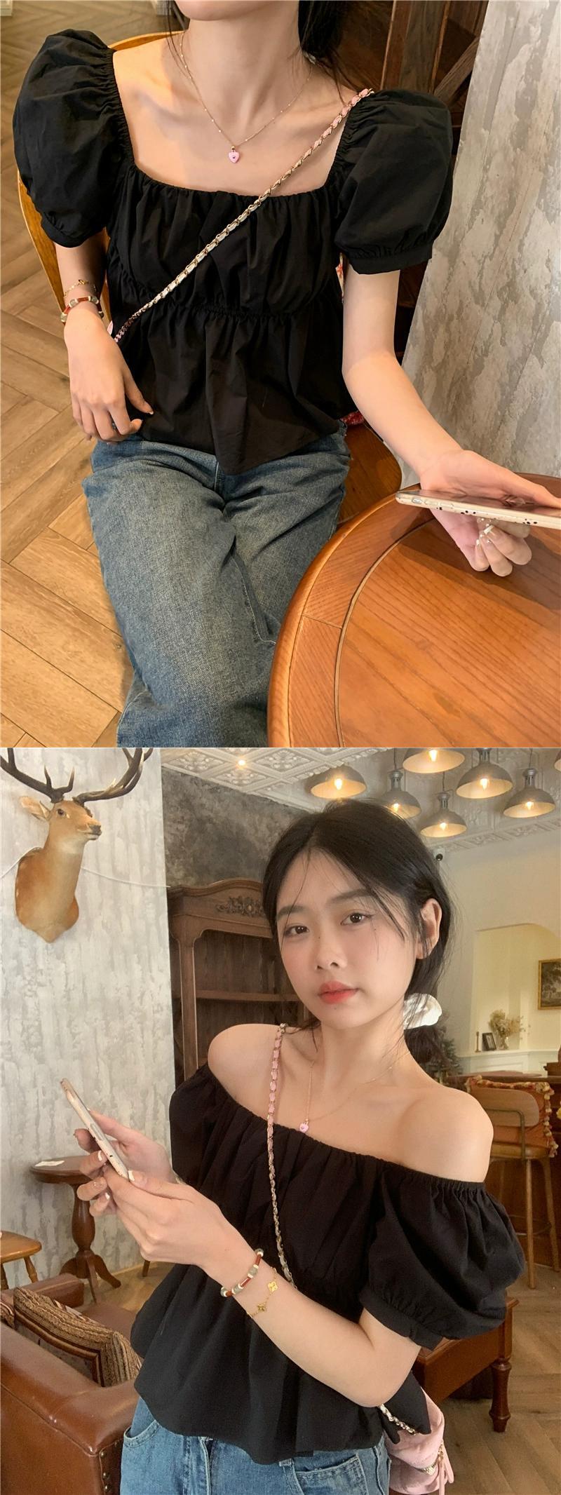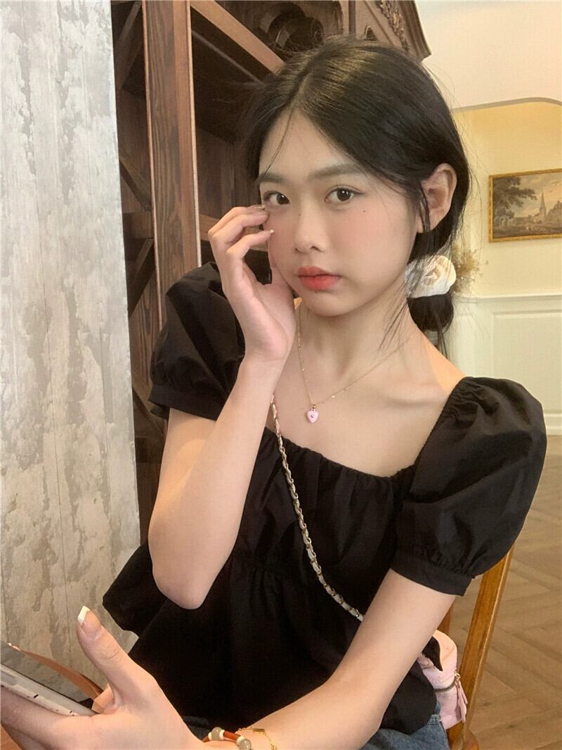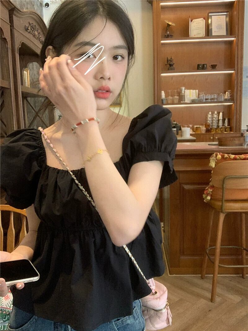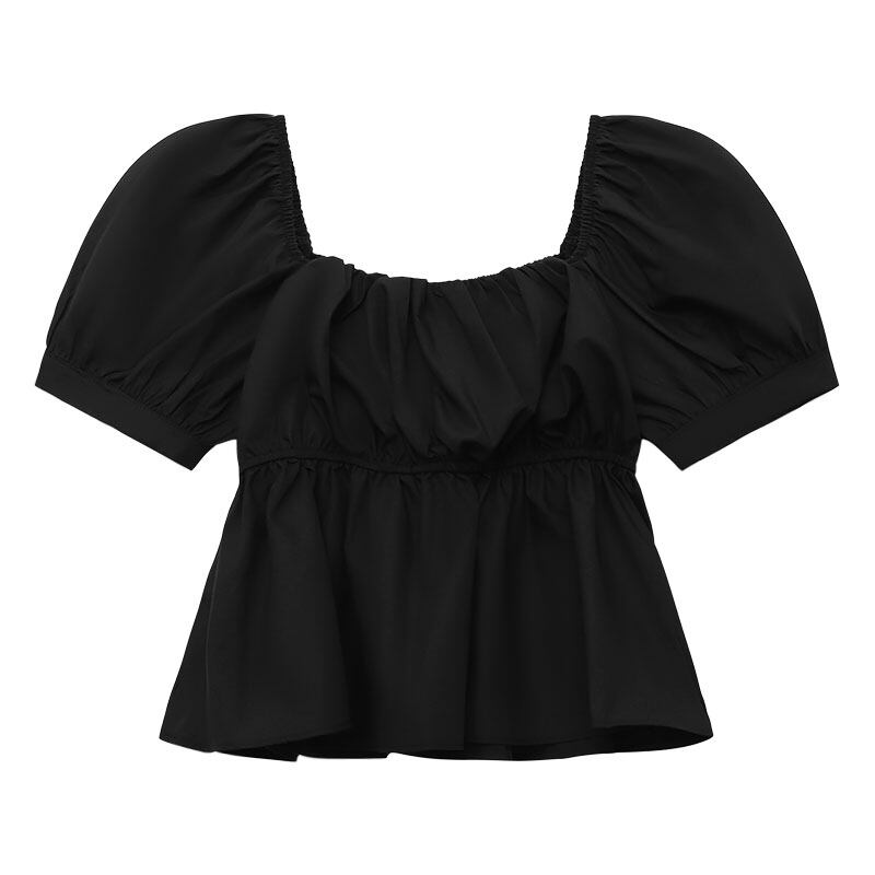 スクエアカラー、パフスリーブ、ワンショルダー半袖シャツ、サマースイート、薄手ショート黒トップス、女性に注意 ブラック 大人ガーリー スウィート キュート カジュアル 夏物 スクウェア missk66548361785