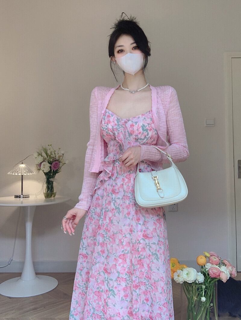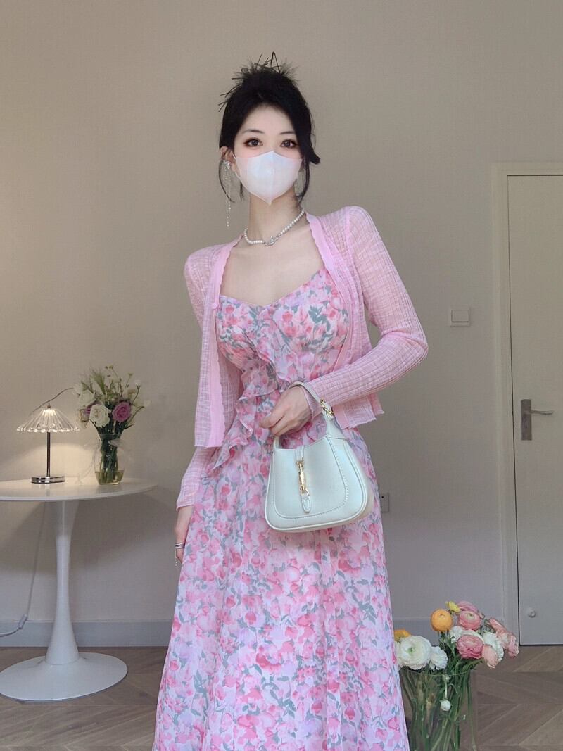 甘い花柄フリルサスペンダードレス女性の夏の 2023 新しいウエストラインスリムミッドレングス A ラインスカート 大人ガーリー スウィート キュート カジュアル サマー 夏物 Aライン missk5363470677