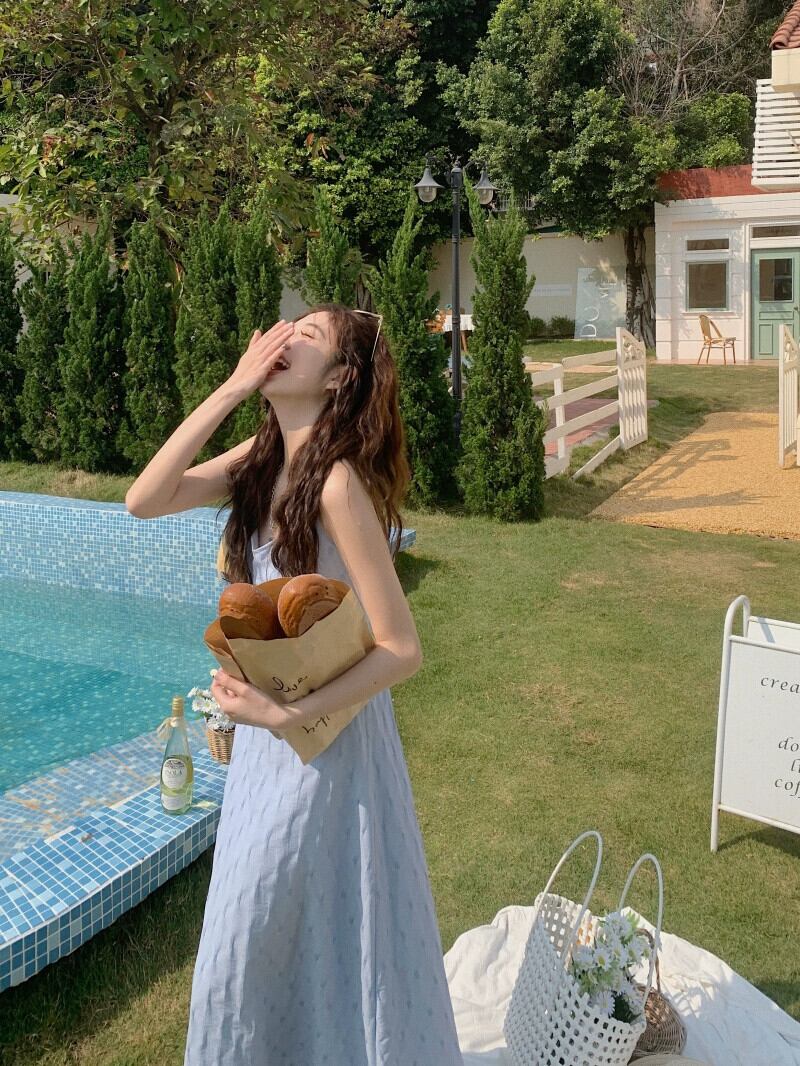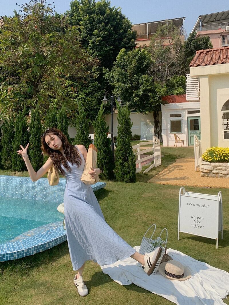 有能なスタイルのブルードレス夏 2023 新しいスタイルベビーカー気質ハイウエスト薄型サスペンダーミッドレングススカート女性 ハイウェスト サマー 夏物 missk53833287399
