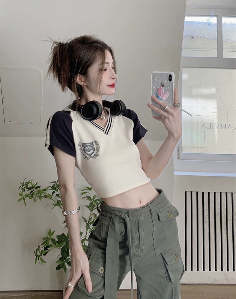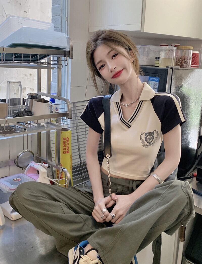 アメリカンスタイルショルダー Tシャツレディース 2023 夏の新しいカレッジスタイルのポロカラースリムフィットプリント半袖トップイン サマー 夏物 missk65313918485