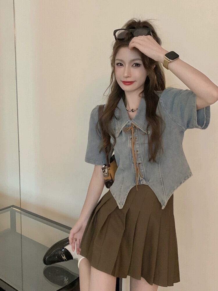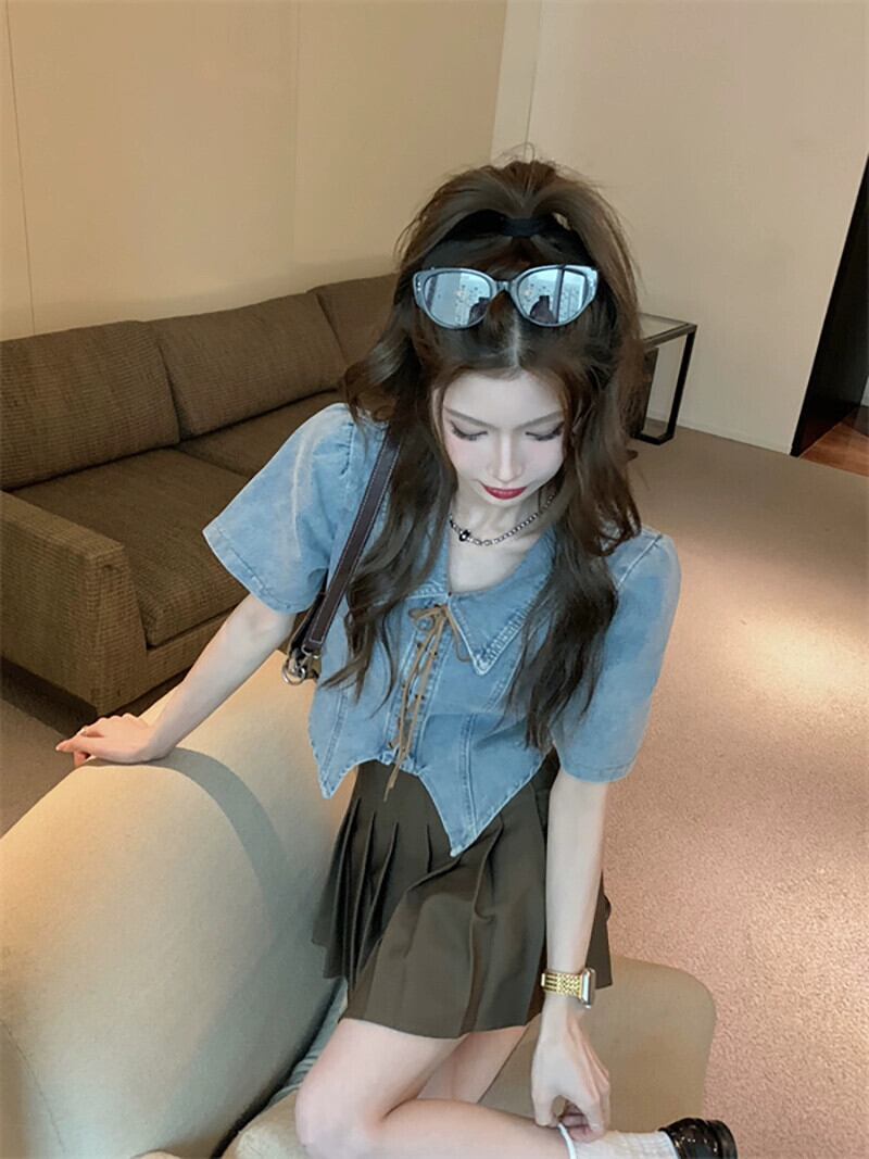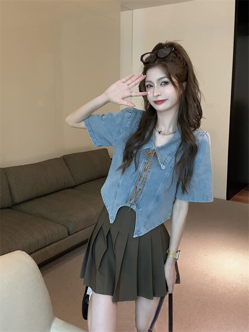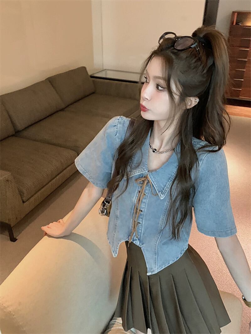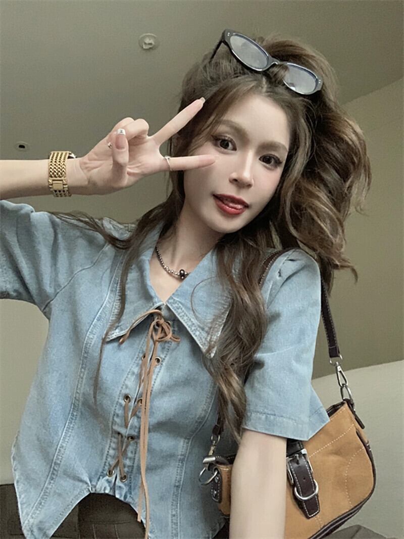ラペルネクタイ半袖デニムシャツレディース 2023 夏の新しいレトロなデザイン不規則なシックなトップ サマー 夏物 missk92452403362