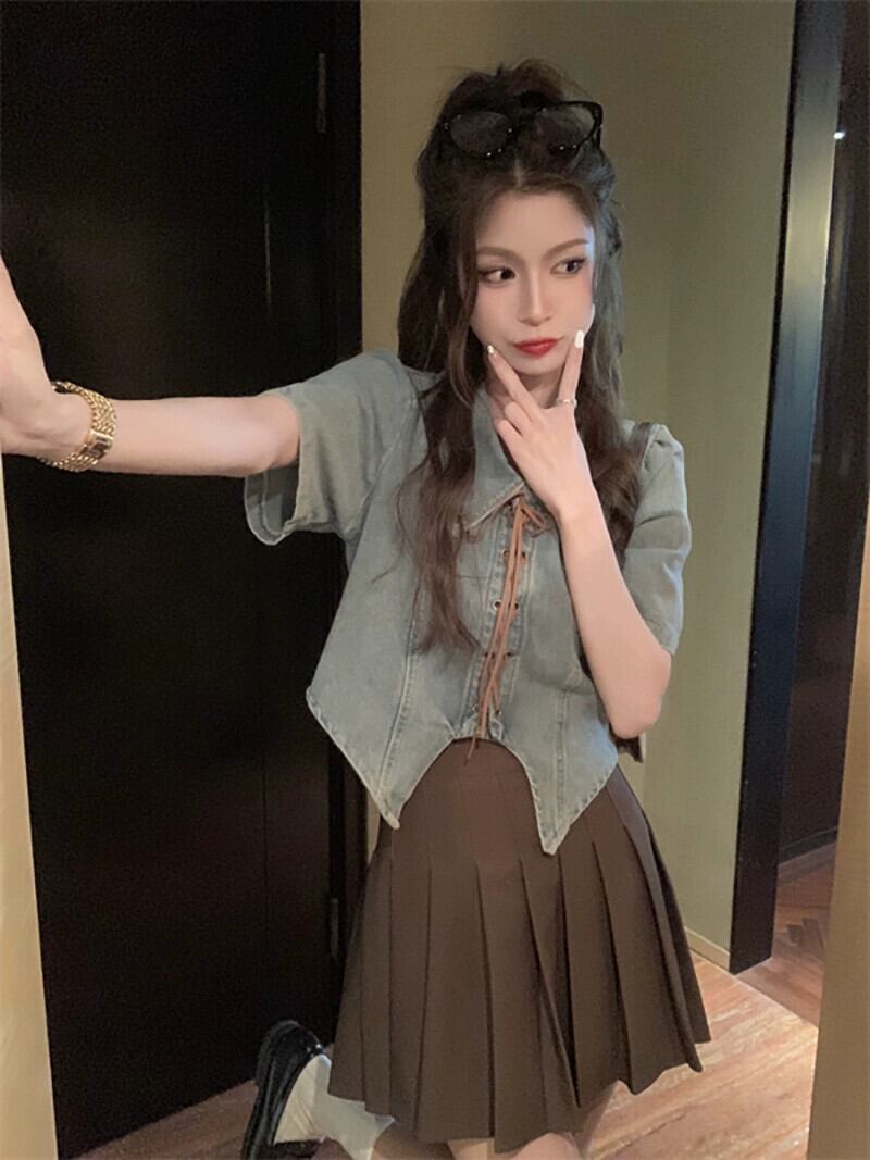 色:ジージャン,コーヒーカラーのプリーツスカート