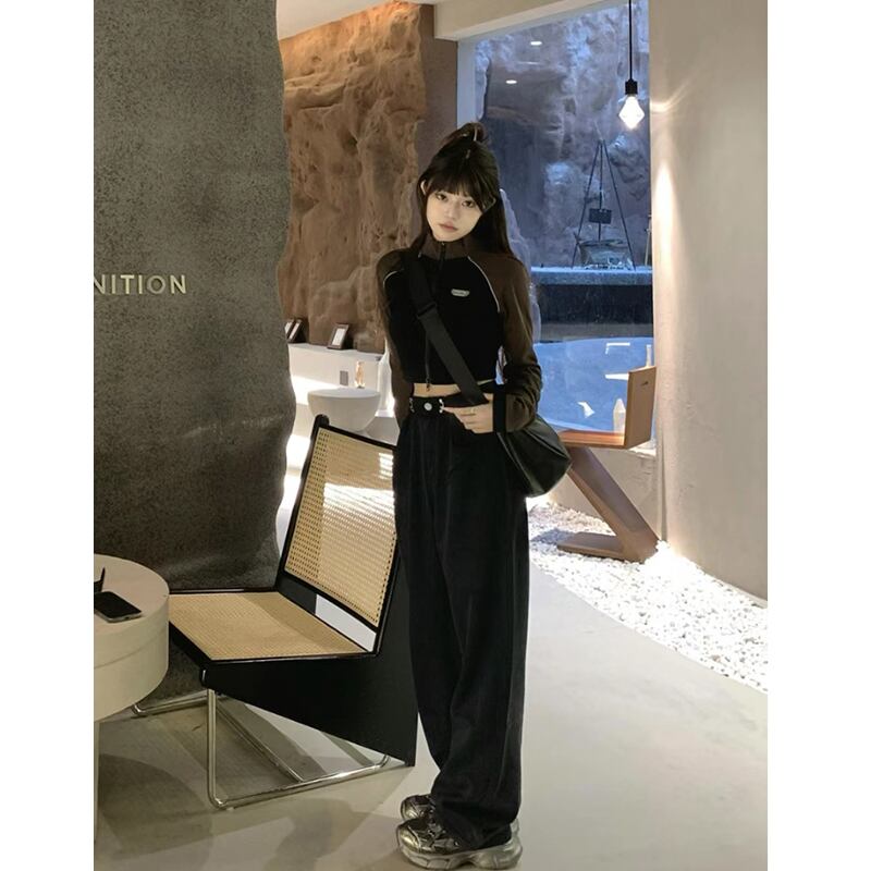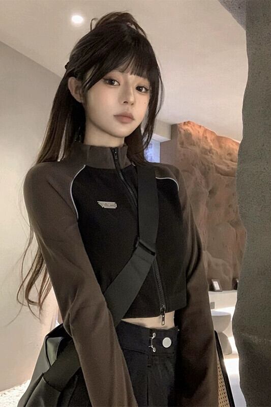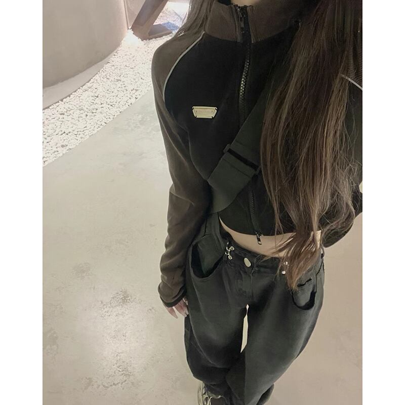 レトロカラーコントラスト長袖ジッパージャケットレディース 2023 春の新作ショートスタイルスリムデザインハイウエストトップ ハイウェスト ロング スプリング 春物 missk89561132408