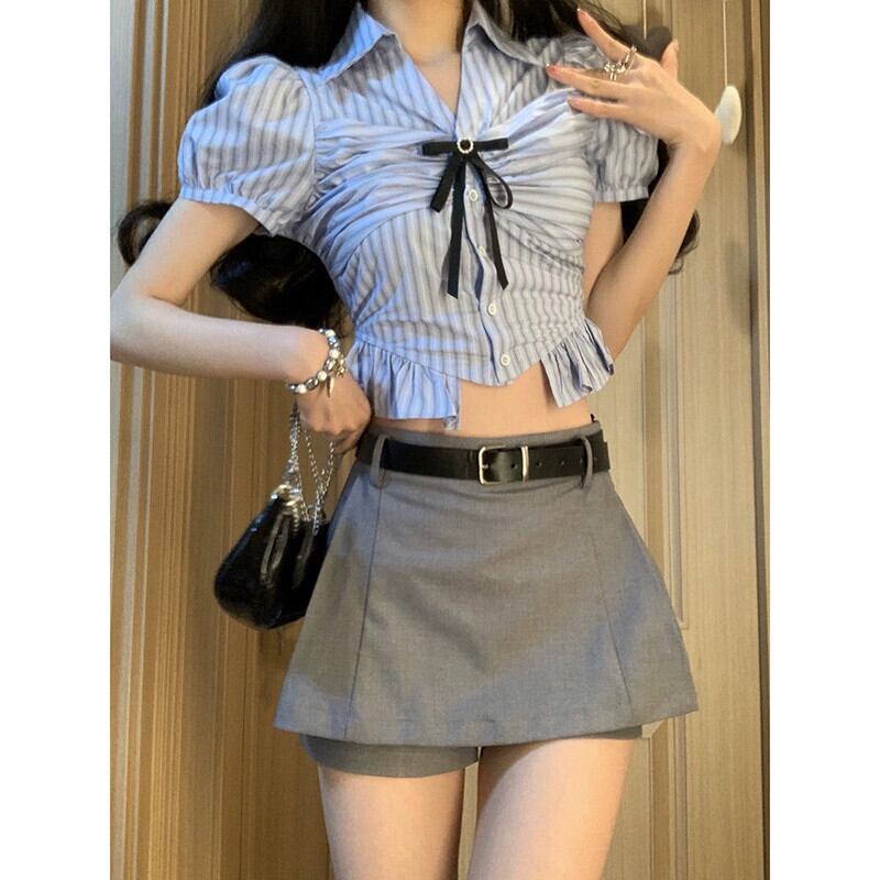 甘辛ストライプちょう結びショートシャツ夏スタイル自己修養カレッジスタイルデザインセンスウエストトップ女性 リボン 大人ガーリー スウィート キュート カジュアル サマー 夏物 missk56809625412