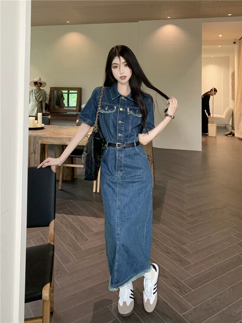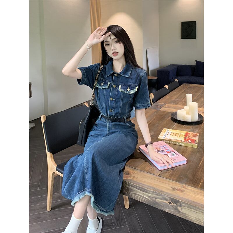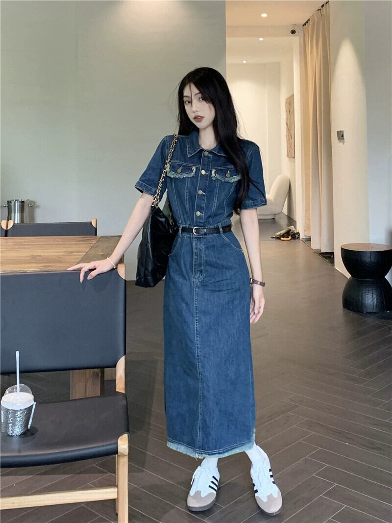 レトロデニムドレスの女性の 2023 夏の新デザインセンスウエスト痩身ミッドレングス気質半袖スカート サマー 夏物 missk98234153642