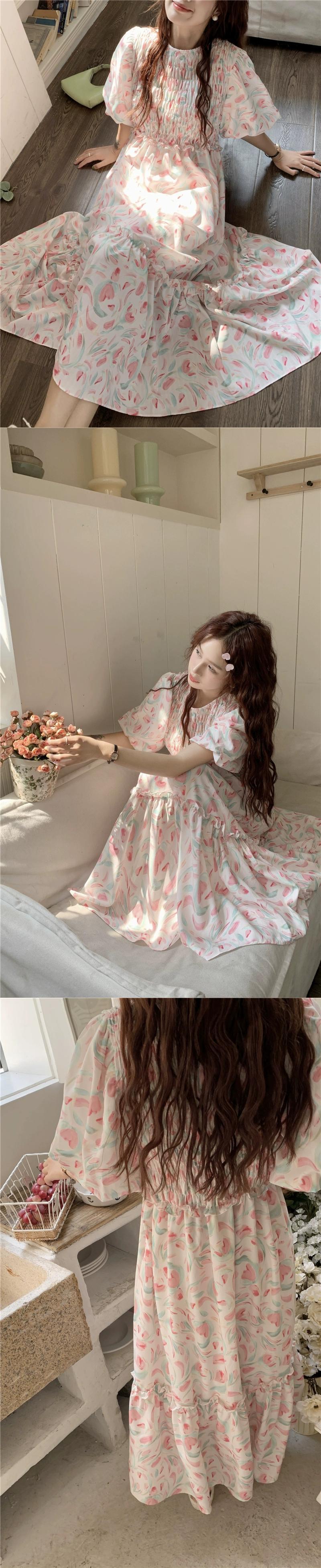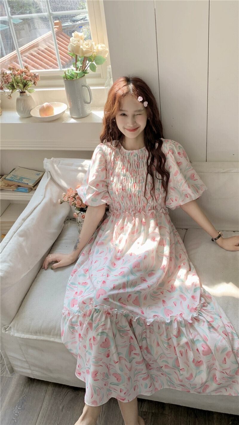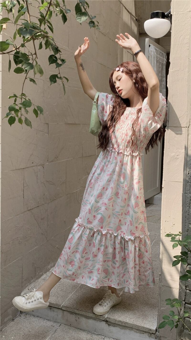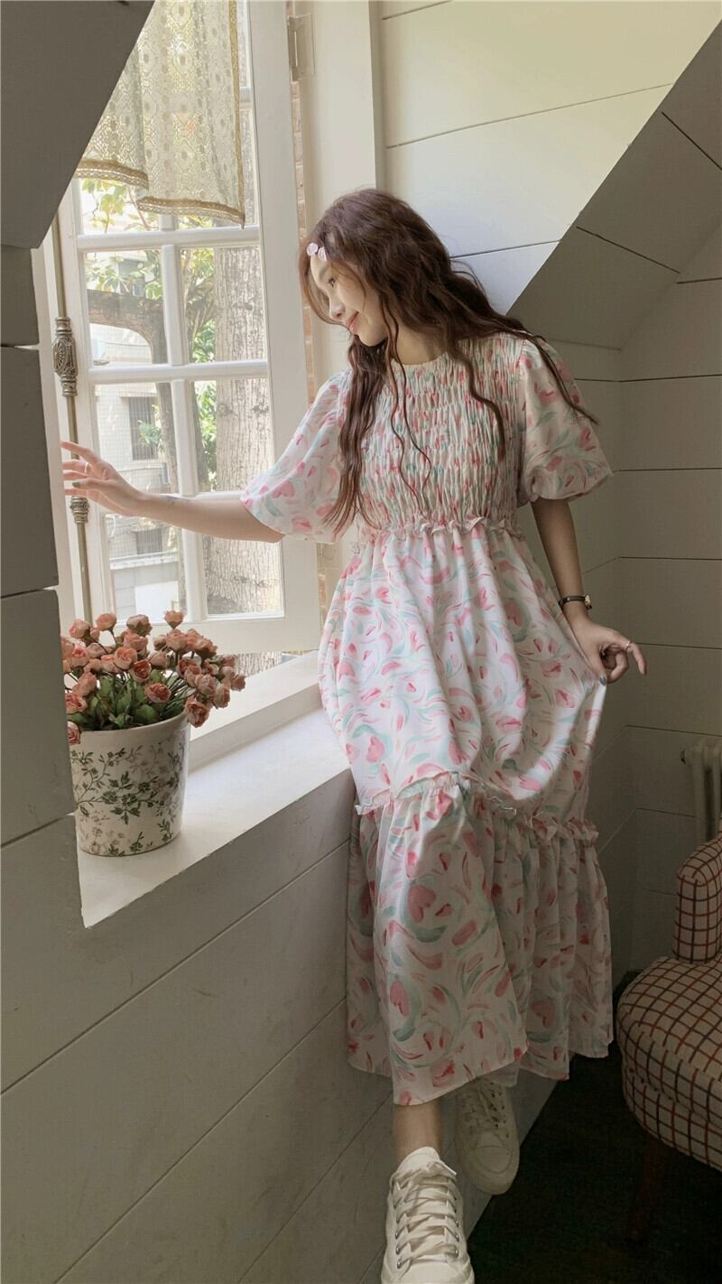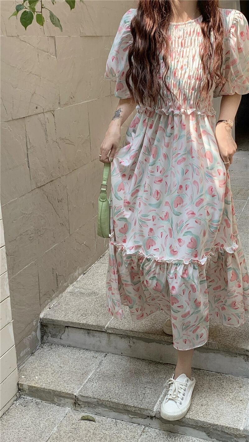 優しい風パフスリーブプリーツドレス夏 2023 新しいファッションウエストロング花柄スカート女性のシック サマー 夏物 missk13122518862