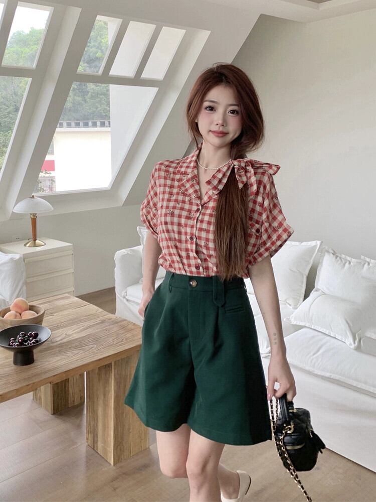 色:グリーンショートパンツ,チェック柄トップス+ヘアバンド