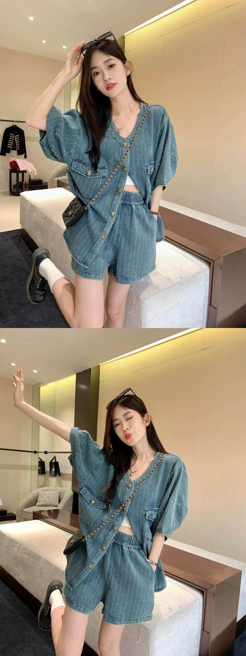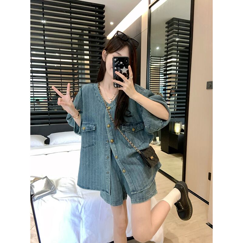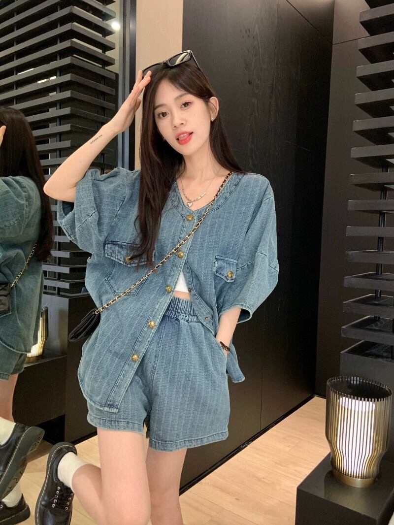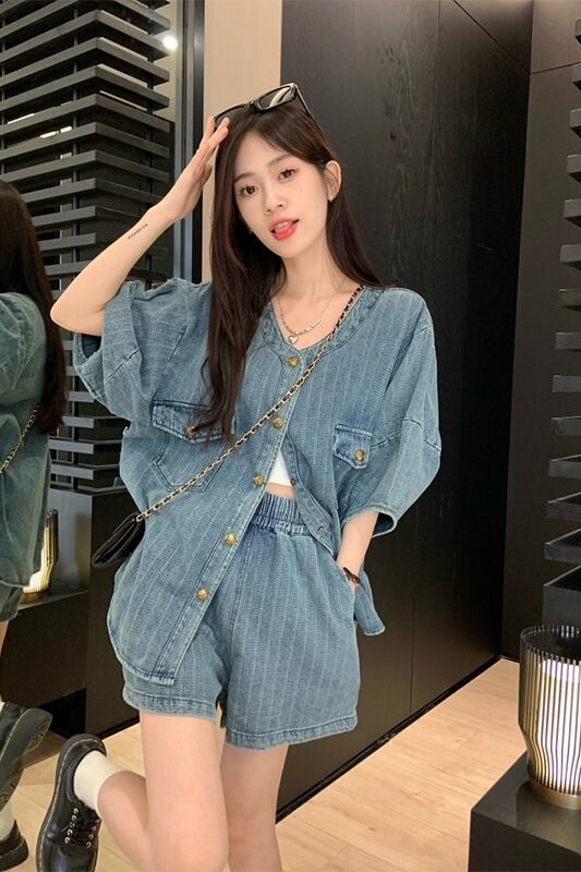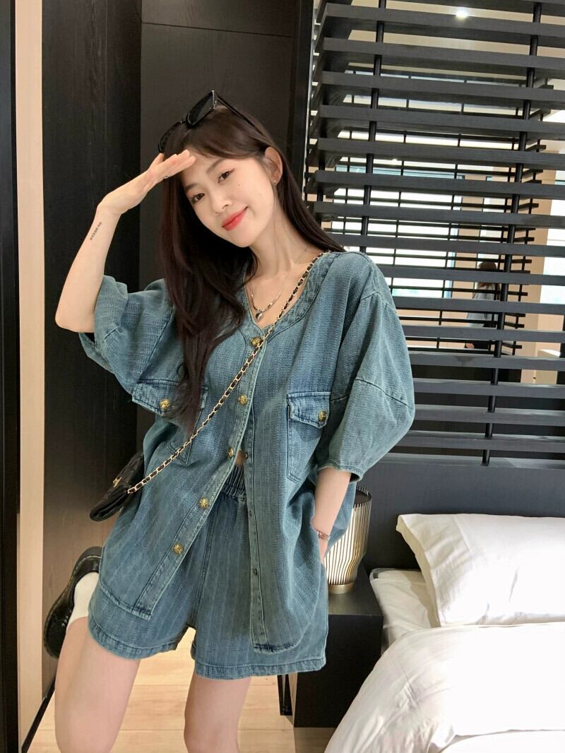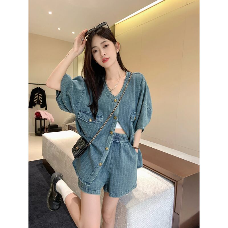 ランタンスリーブデザイン半袖デニムジャケットワイドレッグショーツレディース夏バージョン2023新しいファッション2点セット サマー 夏物 ブルマー missk23002205846