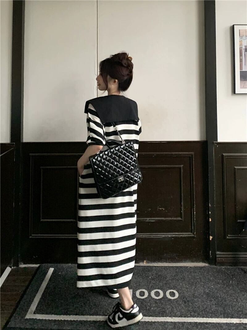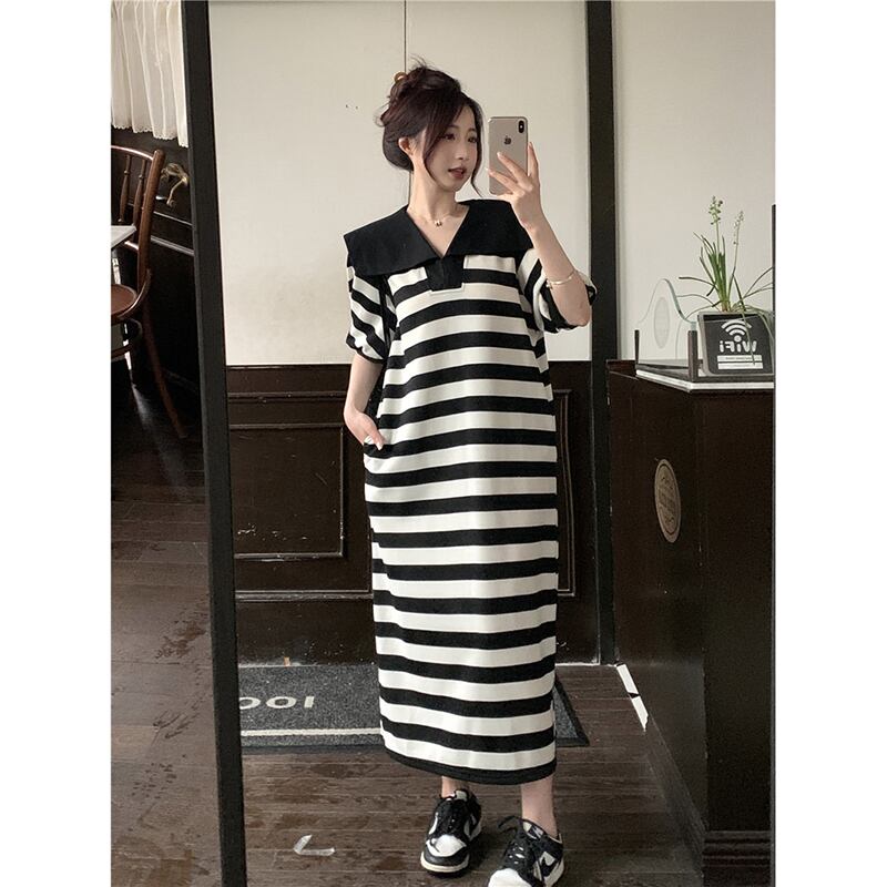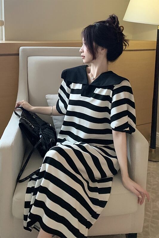 ネイビーカラーストライプ半袖ドレスの女性の夏の 2023 新しいルーズデザインロングパフスリーブスカート サマー 夏物 missk52246918983