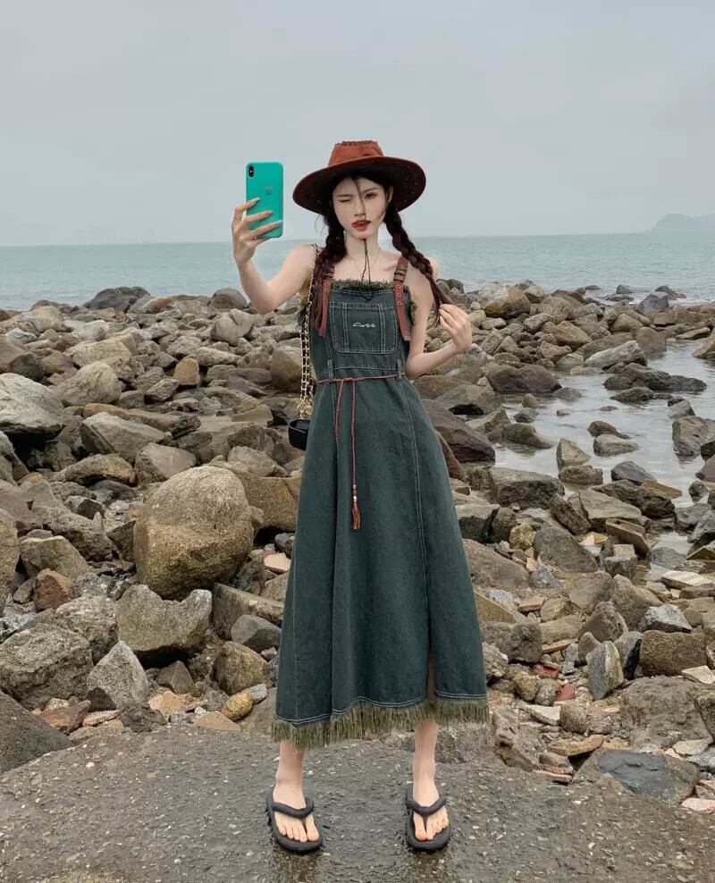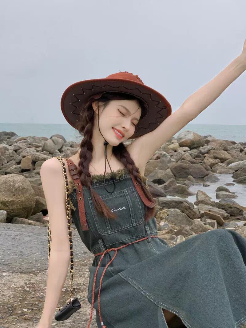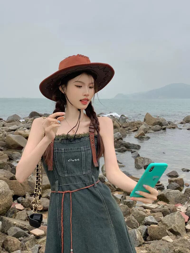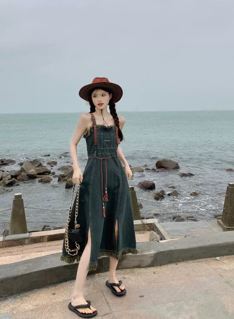 レトロデニムストラップドレスレディース夏新作イン爆発スタイルテルデザイン感ウエストミモレ丈スカート サマー 夏物 missk10214753343