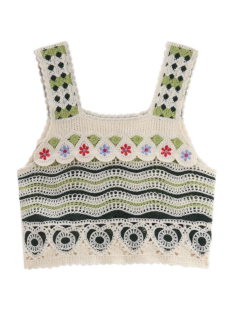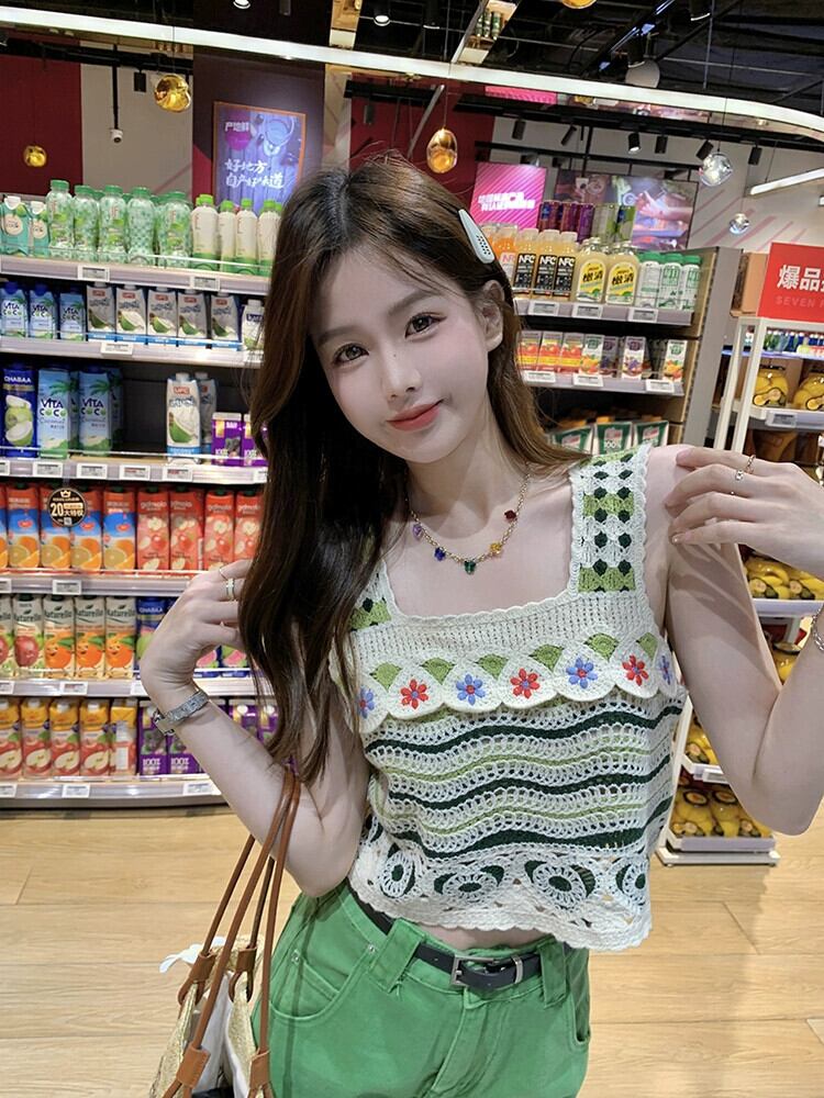 スクエアカラー中空ニットキャミソールレディース夏新作甘いyデザインストライプシックショートトップ 大人ガーリー スウィート キュート カジュアル サマー 夏物 スクウェア missk38903849047