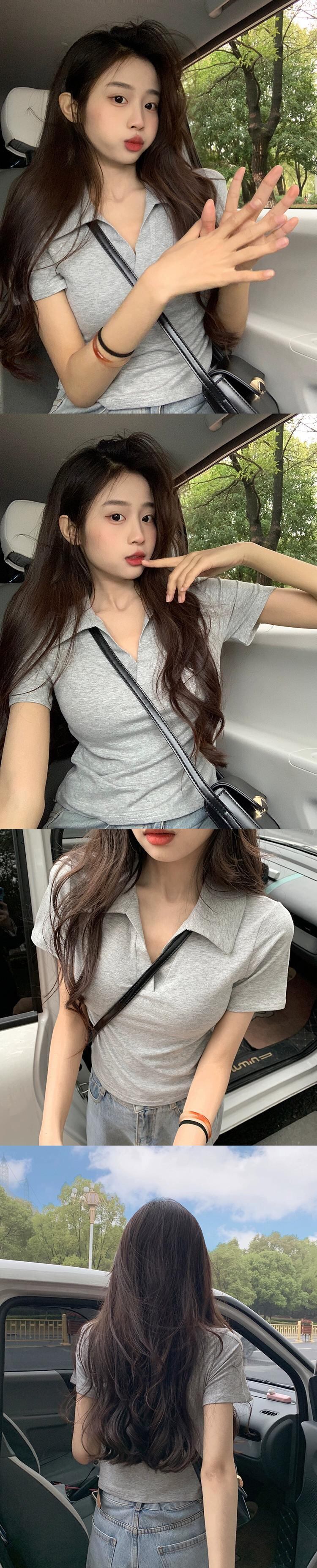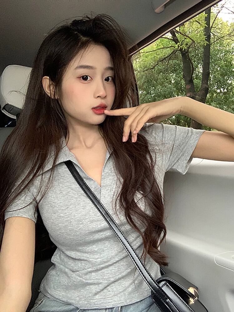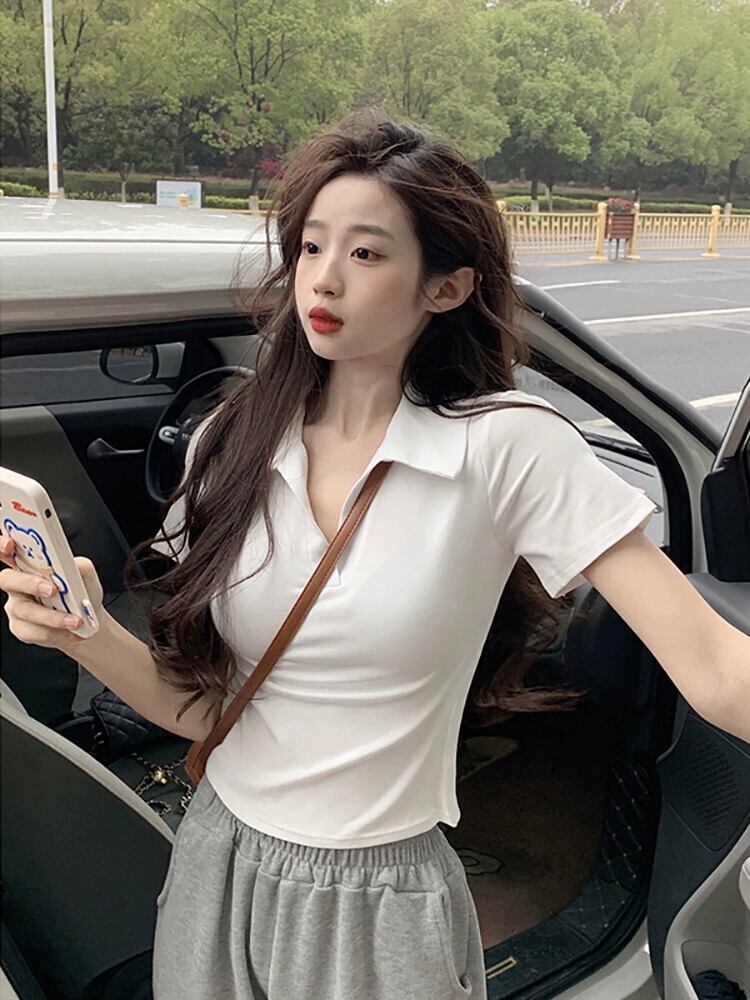 ポロカラー半袖Tシャツレディース夏バージョン2023新しいスリムフィット薄い弾性ショートホワイトピュアデザイアトップ エラスティック 伸縮 サマー 夏物 missk92949293814
