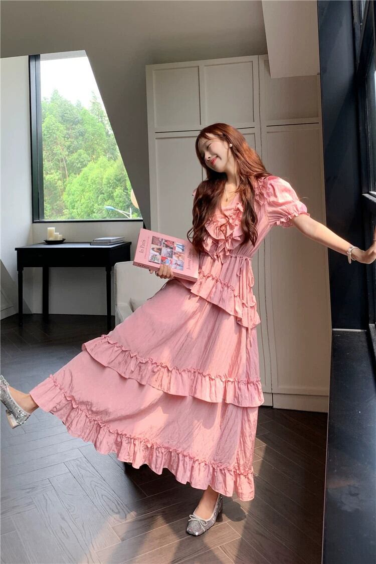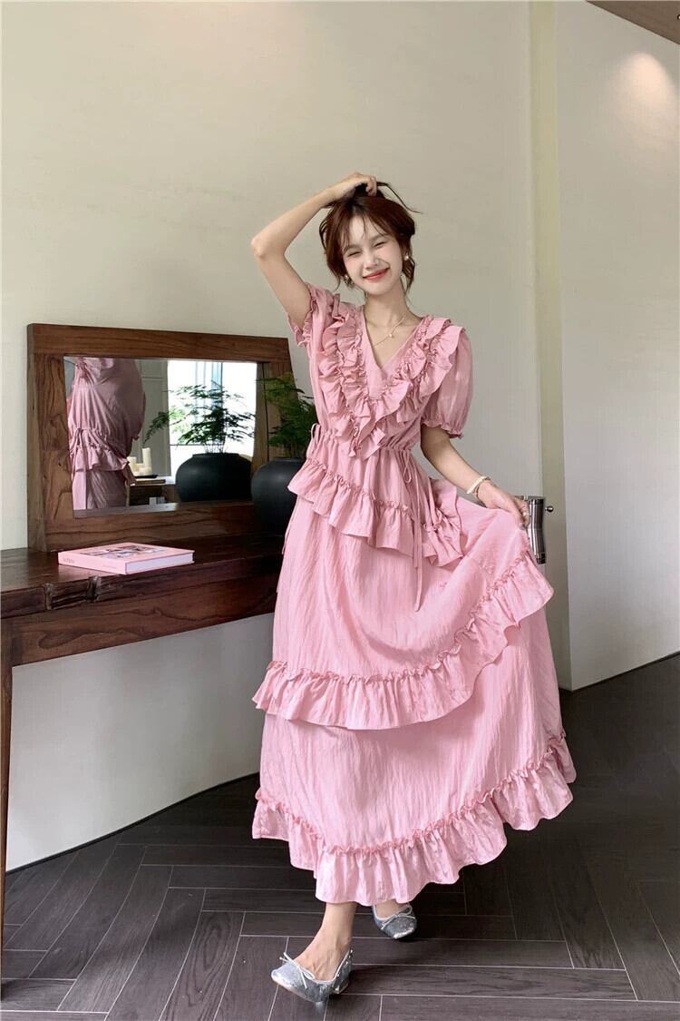 Vネックネクタイ半袖ワンピースレディース夏バージョン2023新デザインセンスフリル一言ビッグスイングロングスカート ラッフル サマー 夏物 missk36635685086