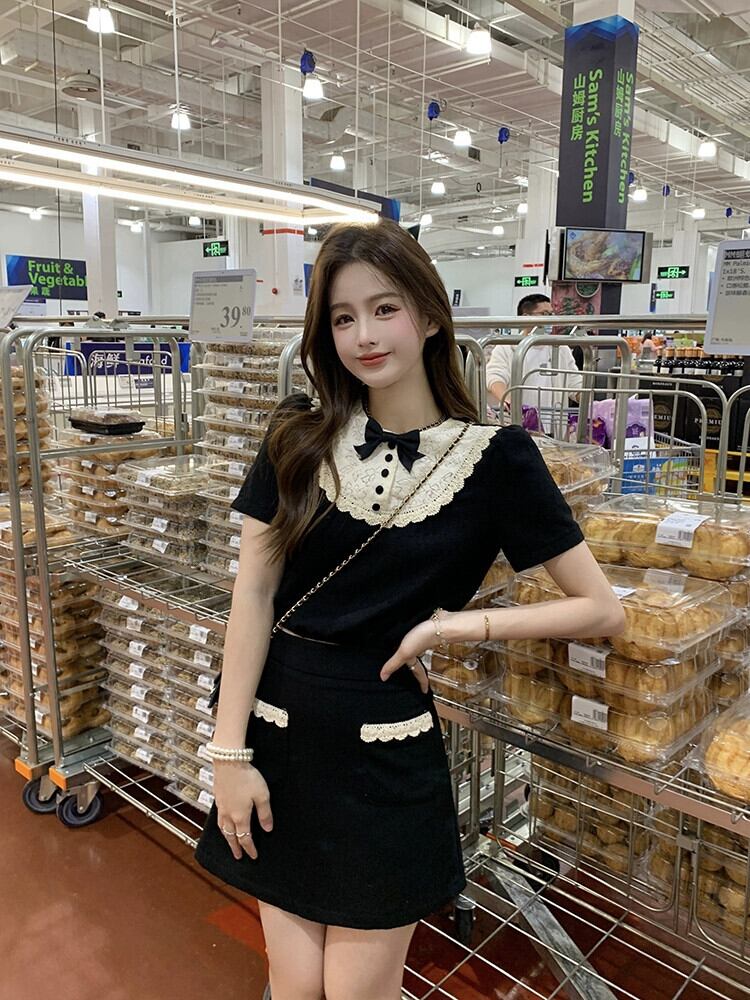 小さな香りのスタイルのレースステッチちょう結び半袖トップハイウエストスカート女性の夏の 2023 新しいファッションスーツ ハイウェスト リボン サマー 夏物 missk98656678552