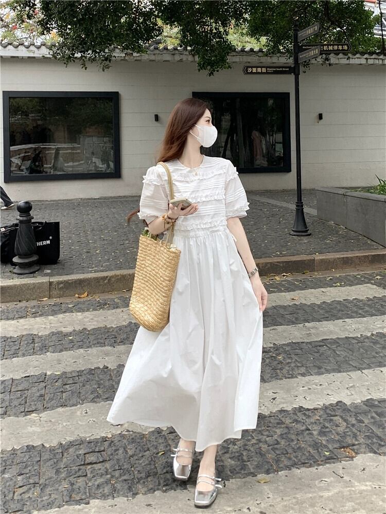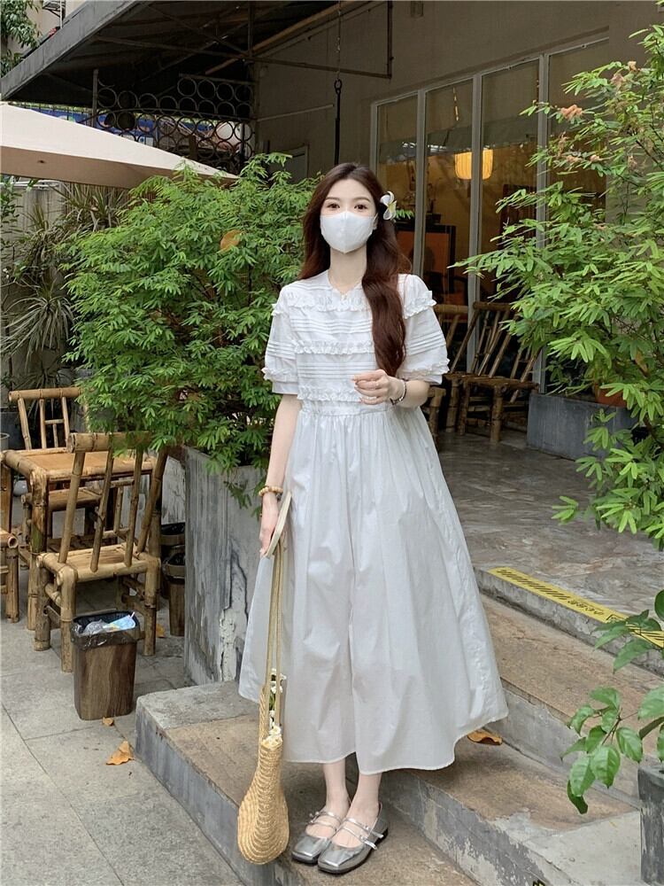 甘いレースプリーツ半袖ドレスの女性の夏の 2023 新しい非常に妖精のウエスト痩身初恋ロングスカート 大人ガーリー スウィート キュート カジュアル サマー 夏物 missk1916885908