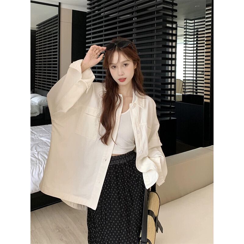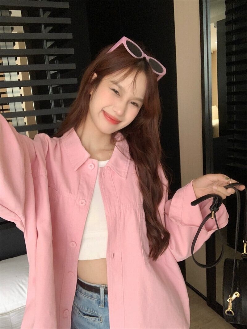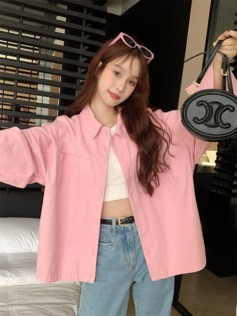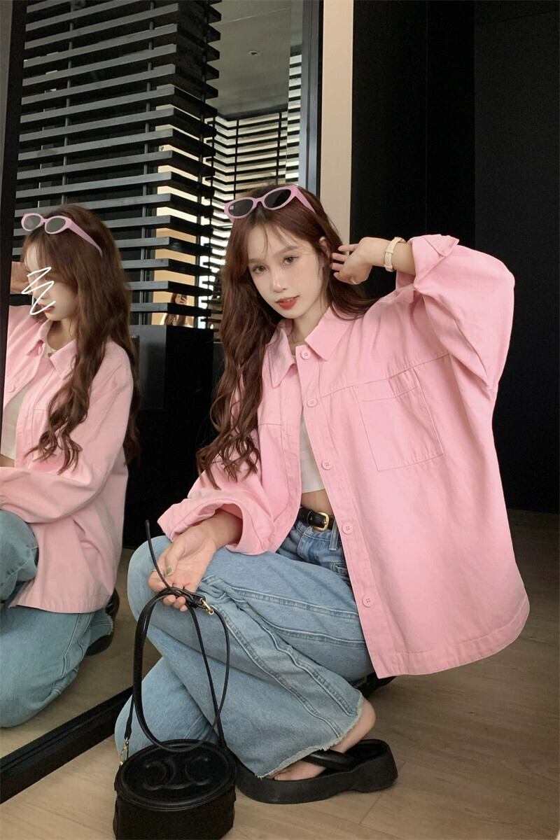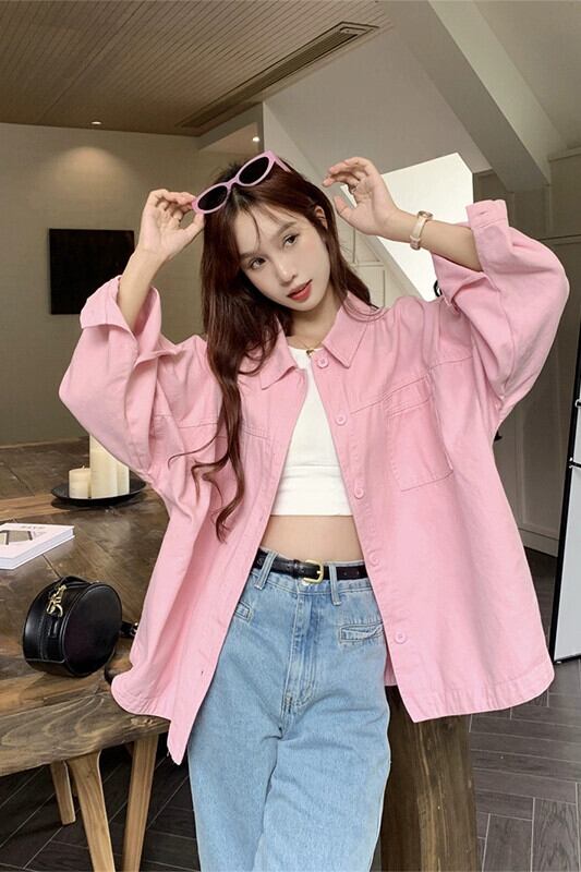 ピンクのポロカラーシャツジャケット夏 2023 新しいファッションファッション年齢削減カジュアルルーズ長袖トップ女性 ロング サマー 夏物 missk741715430