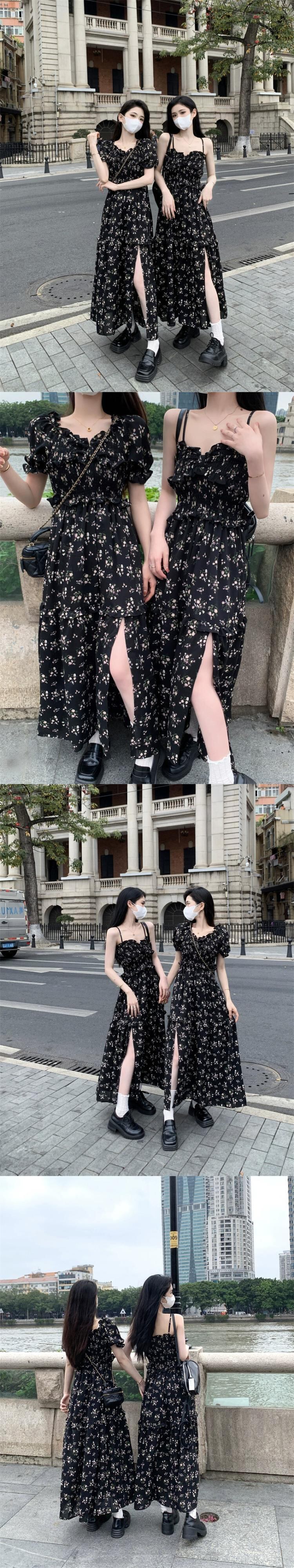黒花柄ドレスの女性の夏の 2023 新しい私室ハニーデザインセンスウエスト痩身スリットスクエアカラースカート ブラック サマー 夏物 スクウェア missk15187583556