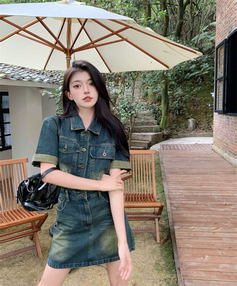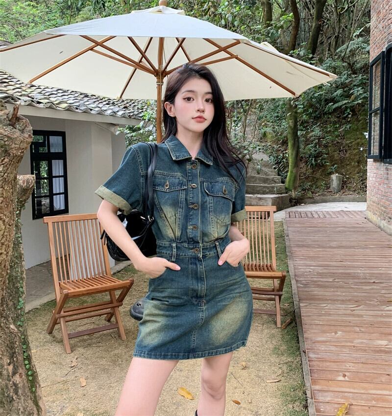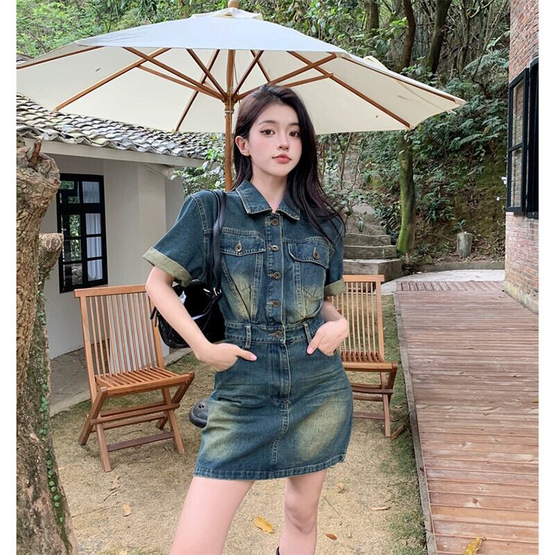 デニムドレスレディース夏バージョン2023新しいポロカラーウエスト痩身塩デザイン半袖スカート サマー 夏物 missk62009461072