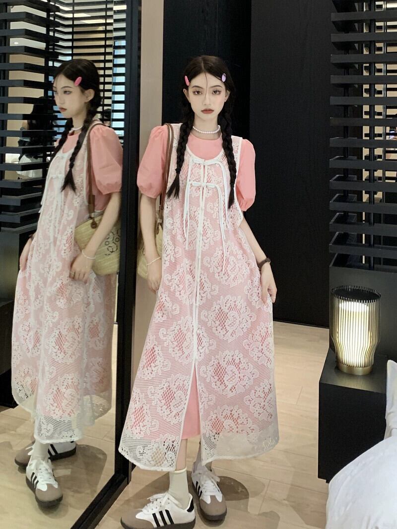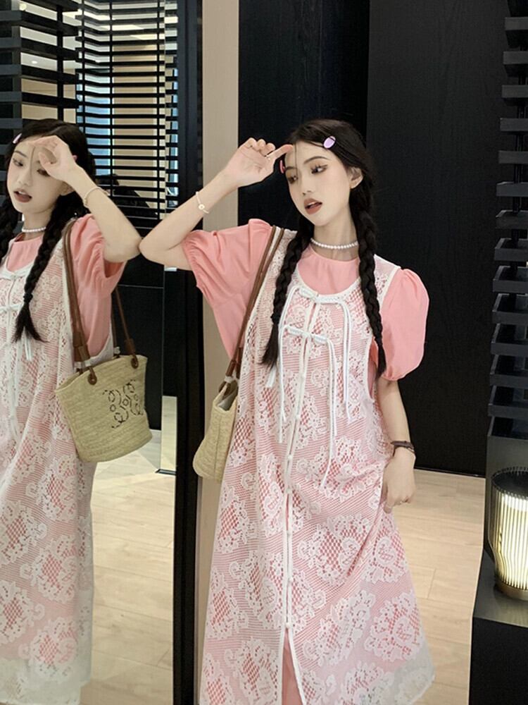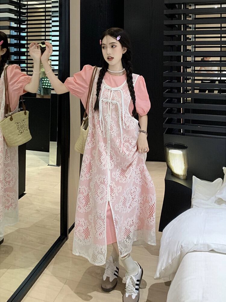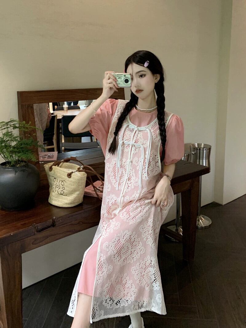 甘いデザインのパフスリーブドレス中空アウトロングブラウス女性の夏の 2023 新しいファッションスーツ 大人ガーリー スウィート キュート カジュアル サマー 夏物 missk8962340090