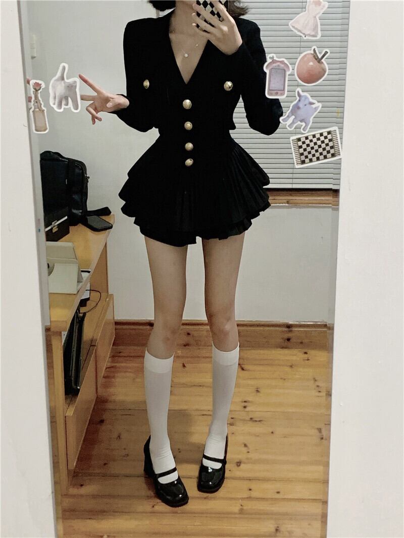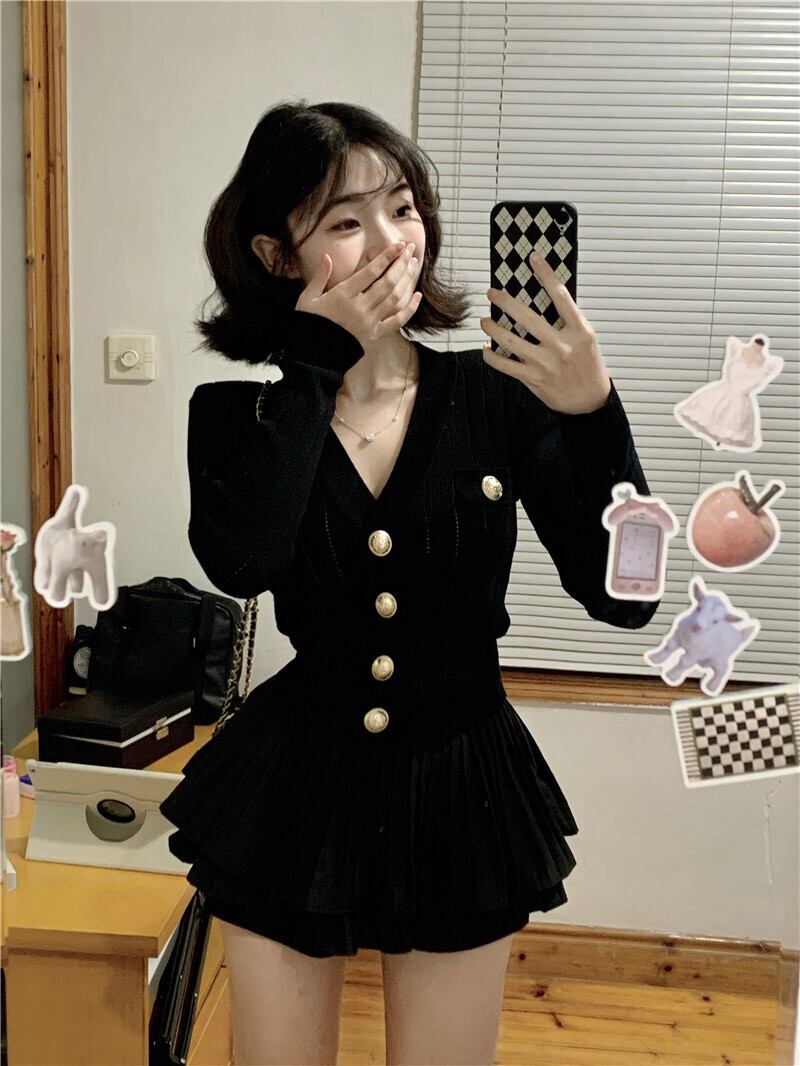 Xiaoxiangfeng V ネックスリムスリム長袖セータープリーツケーキスカート女性の夏の 2023 新しい 2 点セット ロング サマー 夏物 Vネック missk98764123581
