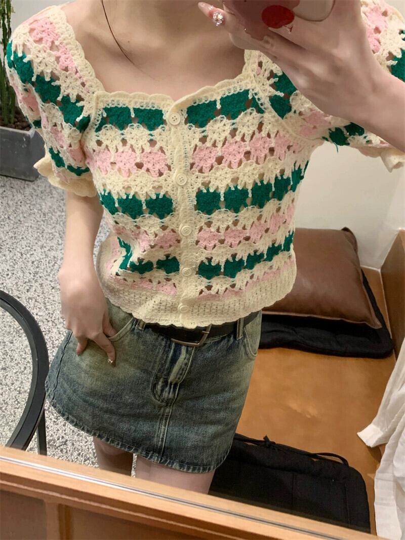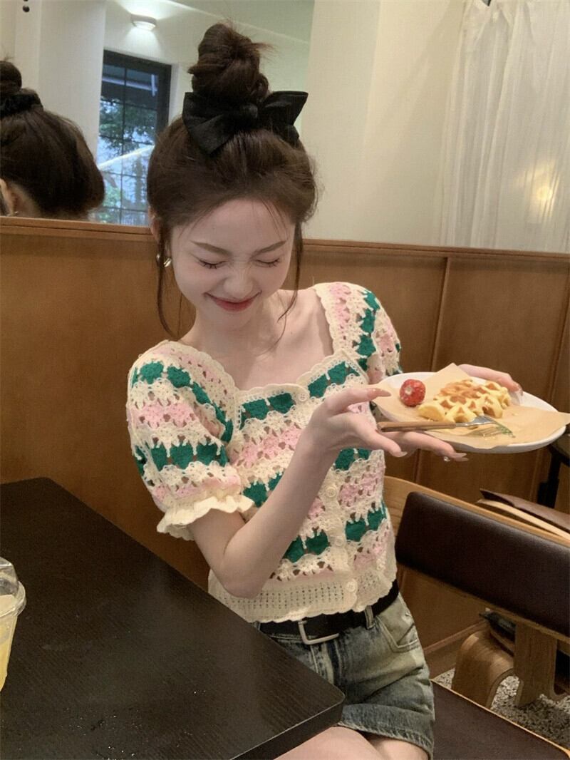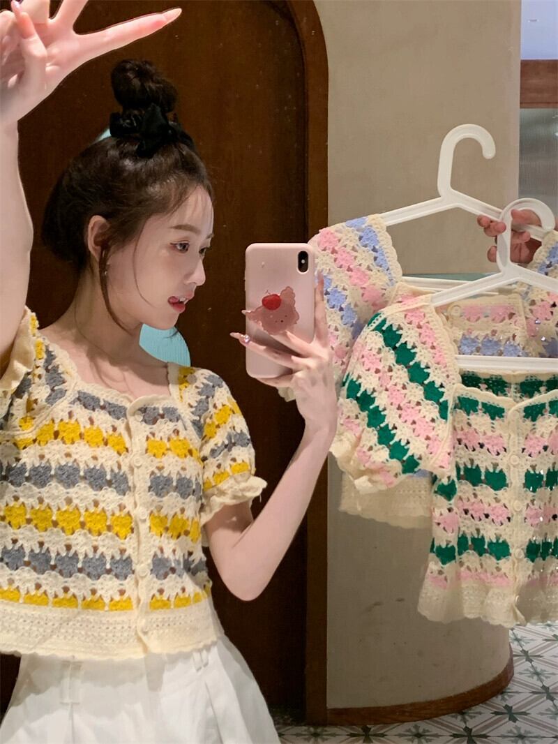 スリムかぎ針編み中空ニットセーター夏 2023 Sweet Girl 半袖シャツトップレディース 大人ガーリー スウィート キュート カジュアル サマー 夏物 missk5887503470
