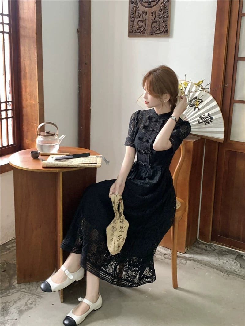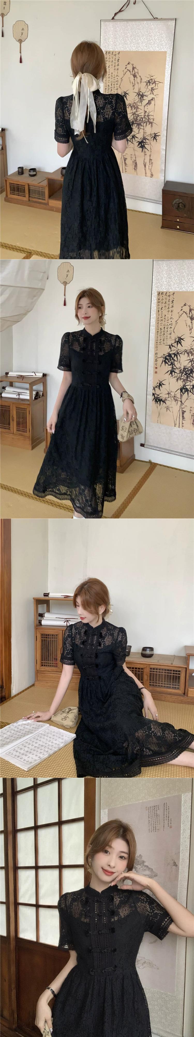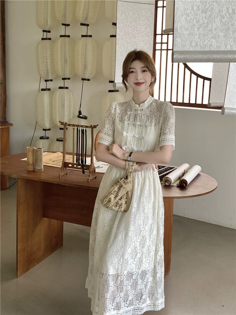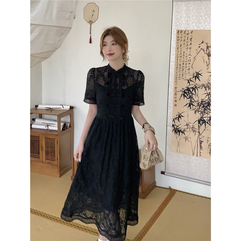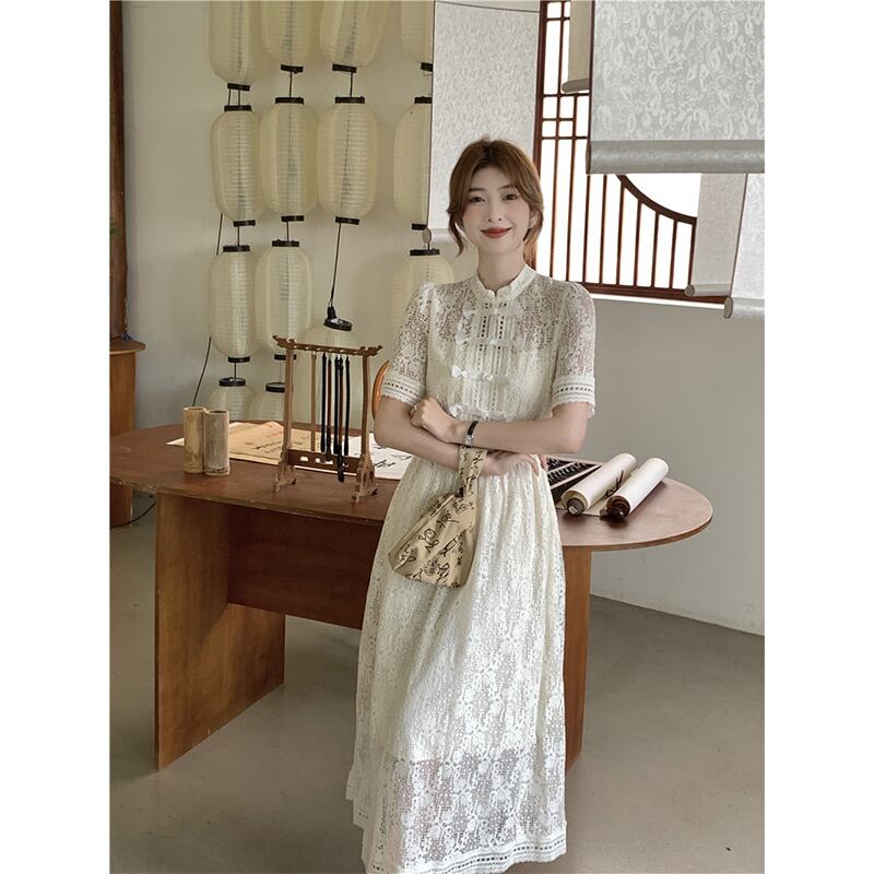 中国風ドレスの女性の 2023 夏の新デザインセンス中空レース気質スリムウエスト半袖スカート サマー 夏物 missk66986889836