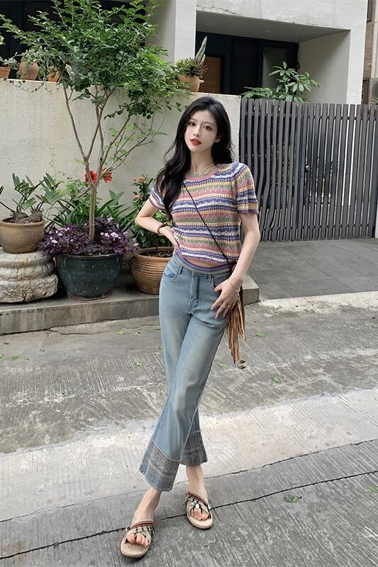 色:ストレートジーンズ,レインボーストライプニットセーター