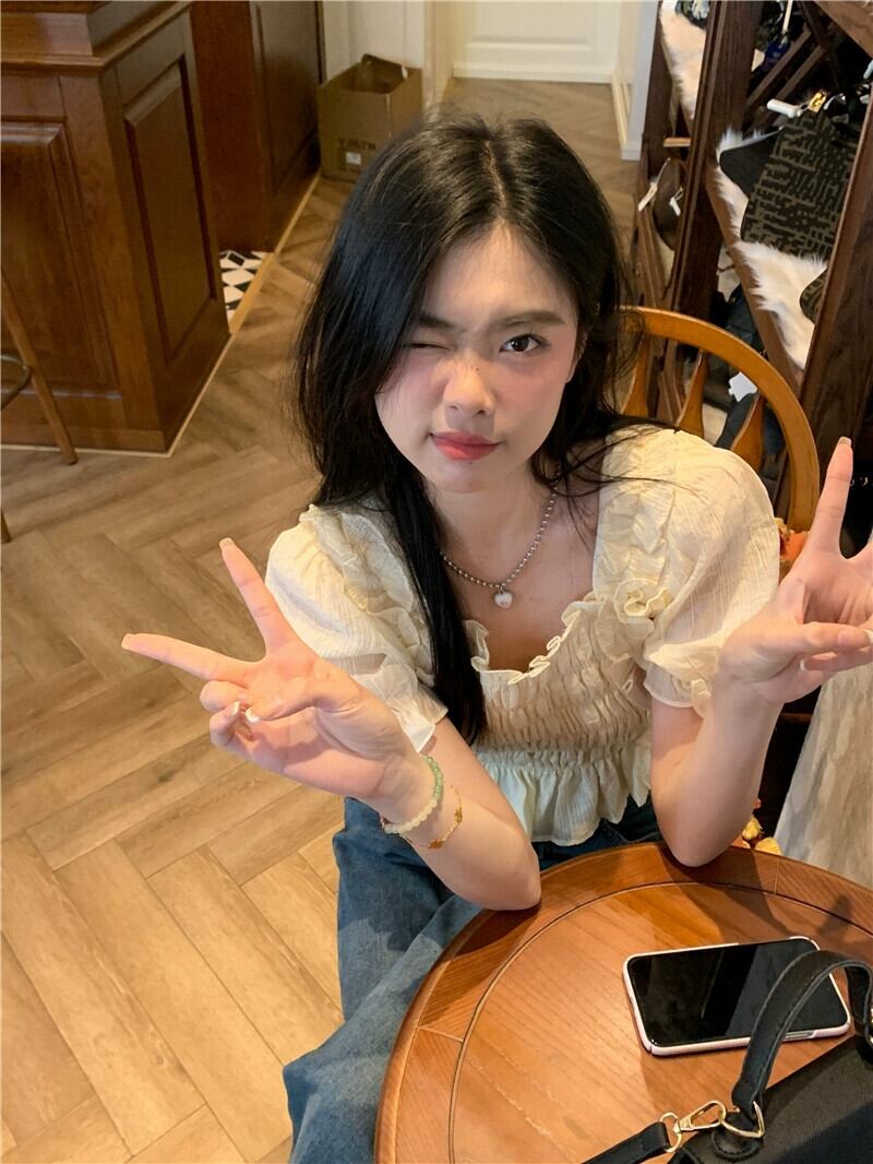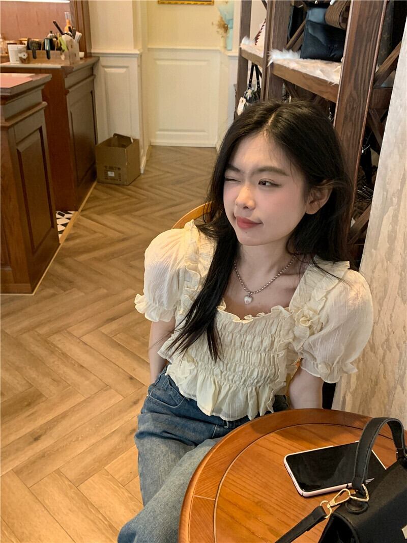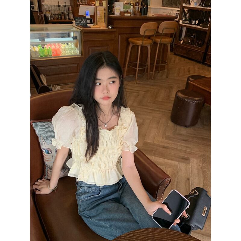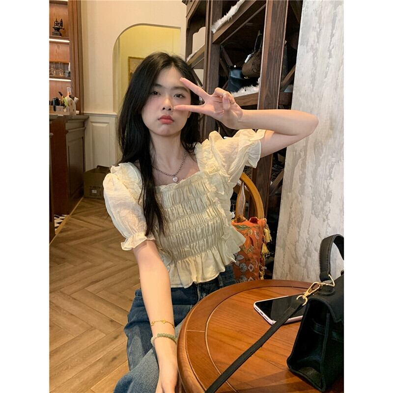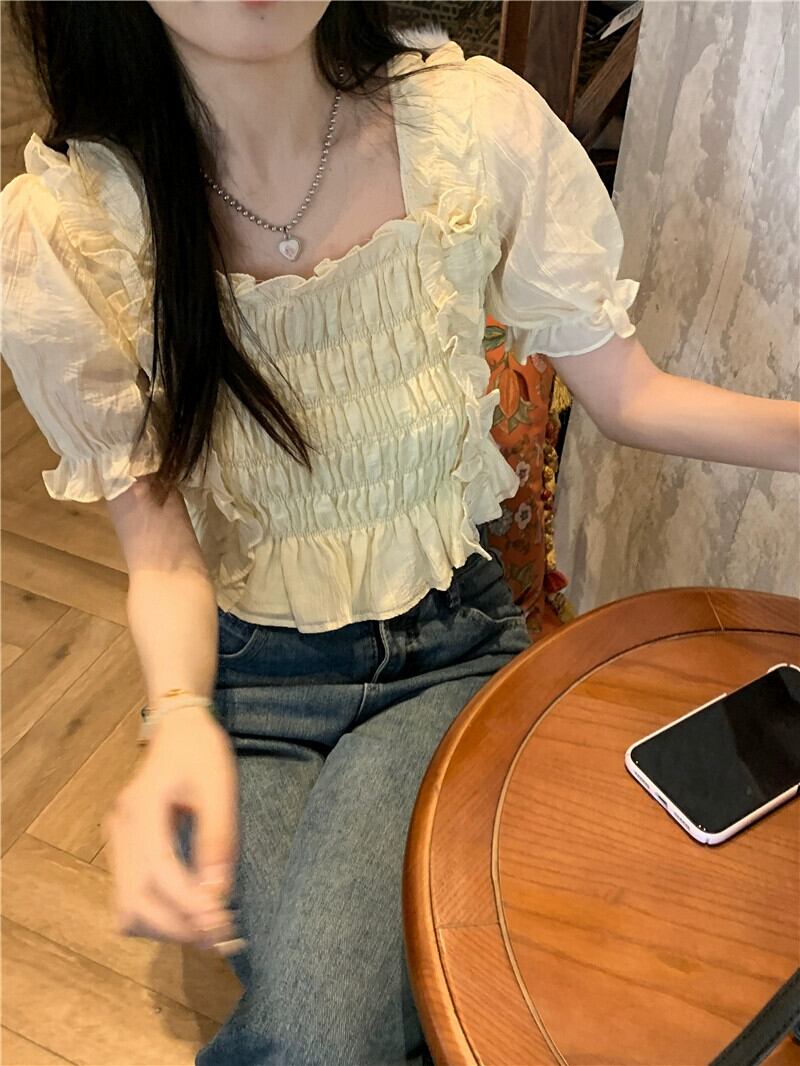 夏甘い 2023 新しい eign スタイルプリーツ菌サイドショートファッションスクエアカラースリムフィットスリム半袖シャツ女性 大人ガーリー スウィート キュート カジュアル サマー 夏物 スクウェア missk35110584667