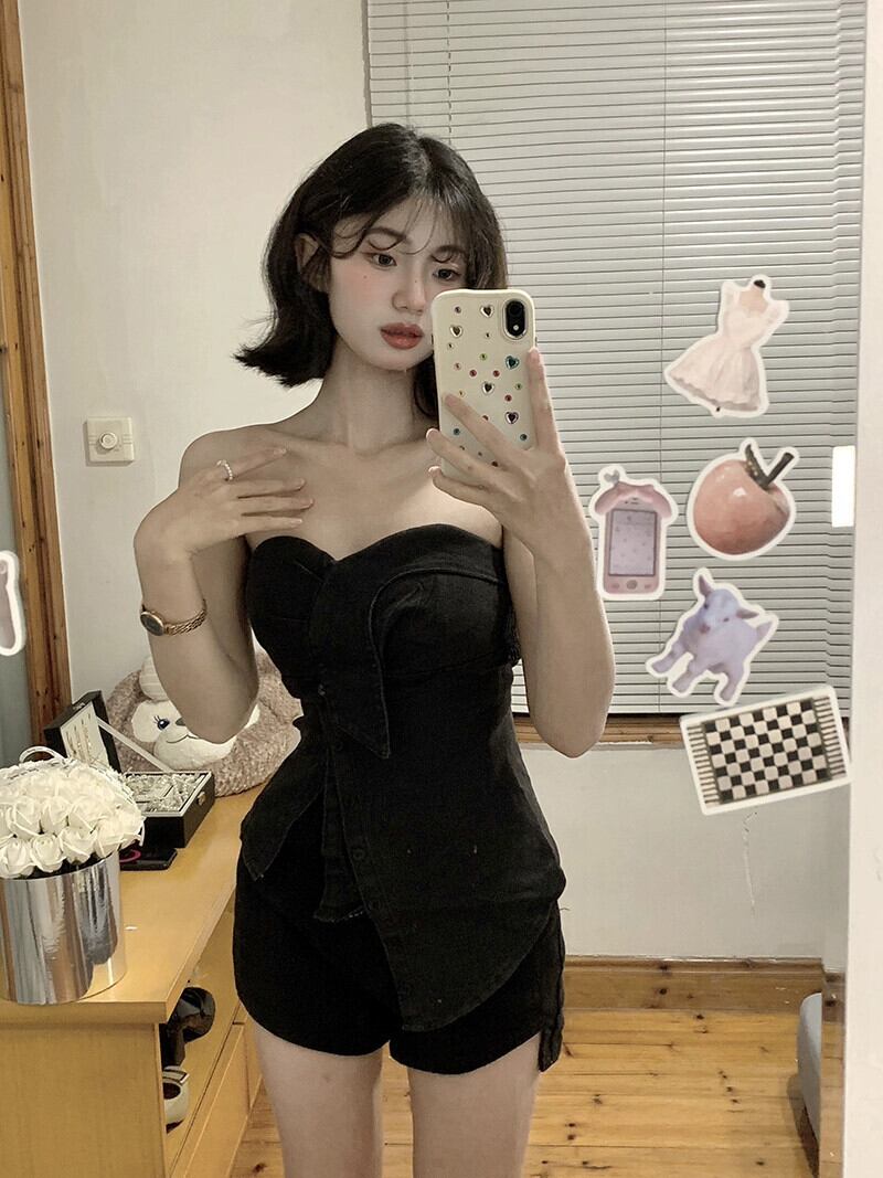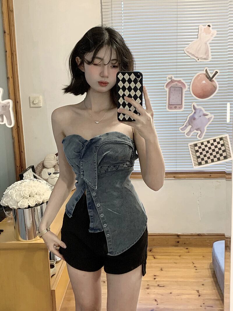 2023年夏の新バージョンのスリムフィットと薄いデザイン感の不規則な純粋な欲望のデニムラップチェストトップ女性の潮流 サマー 夏物 ピュア missk15723925947