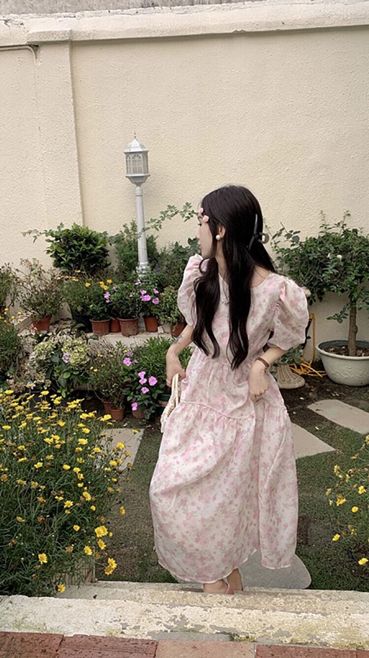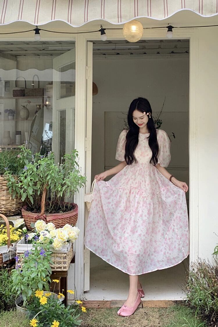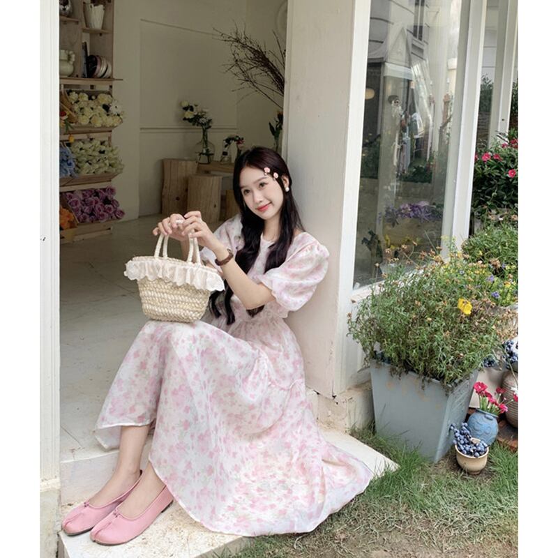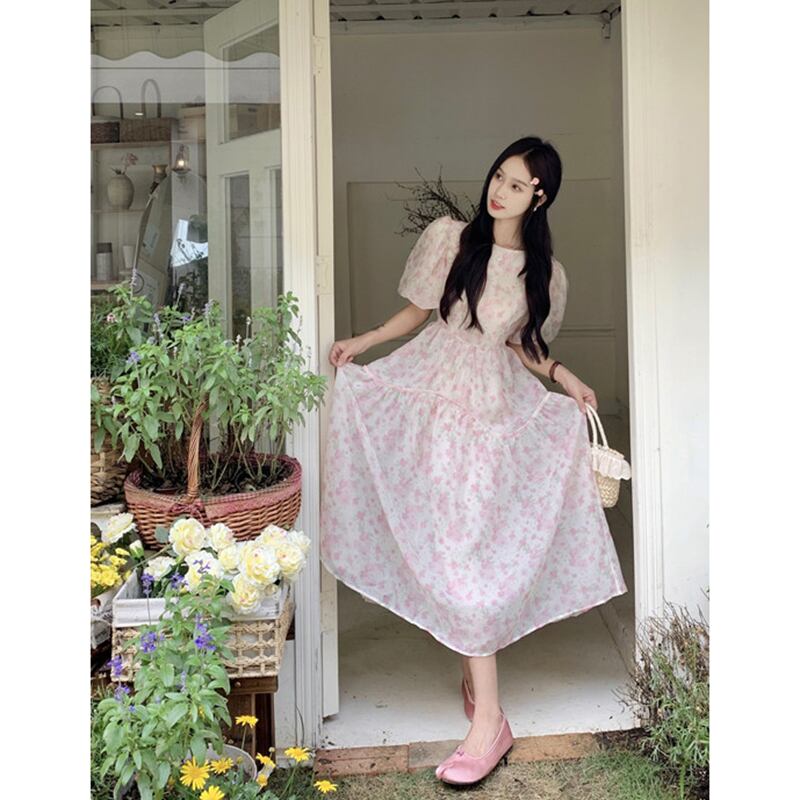 甘いフランスの花柄パフスリーブドレス夏 2023 ウエストスリムミッドレングススーパーフェアリーティーブレイクドレス 大人ガーリー スウィート キュート カジュアル サマー 夏物 missk24462332044
