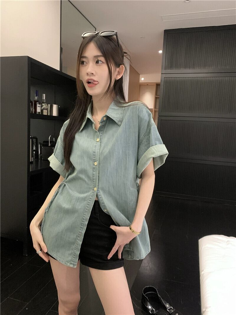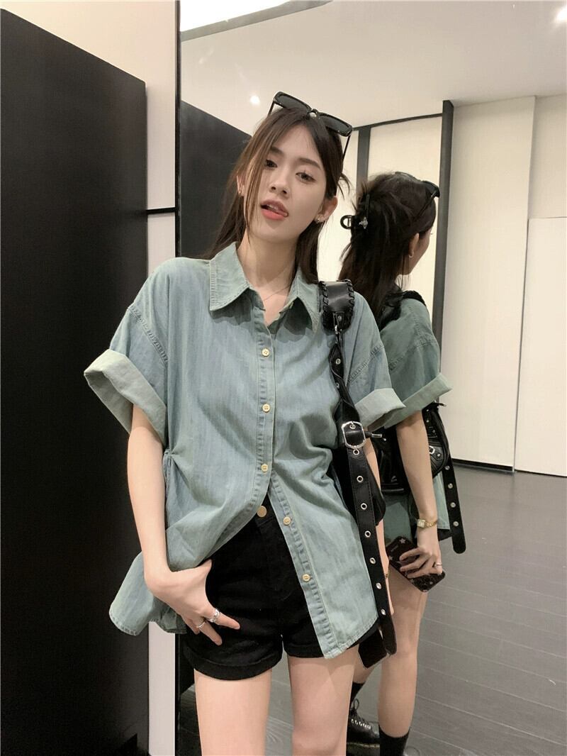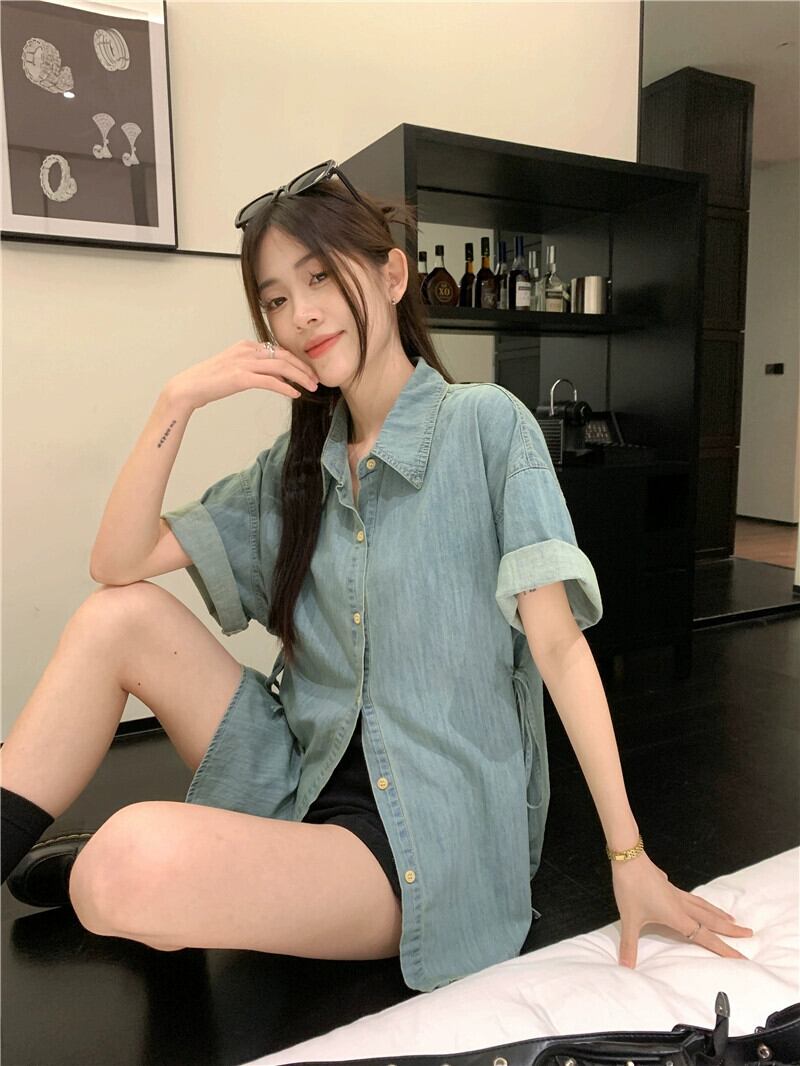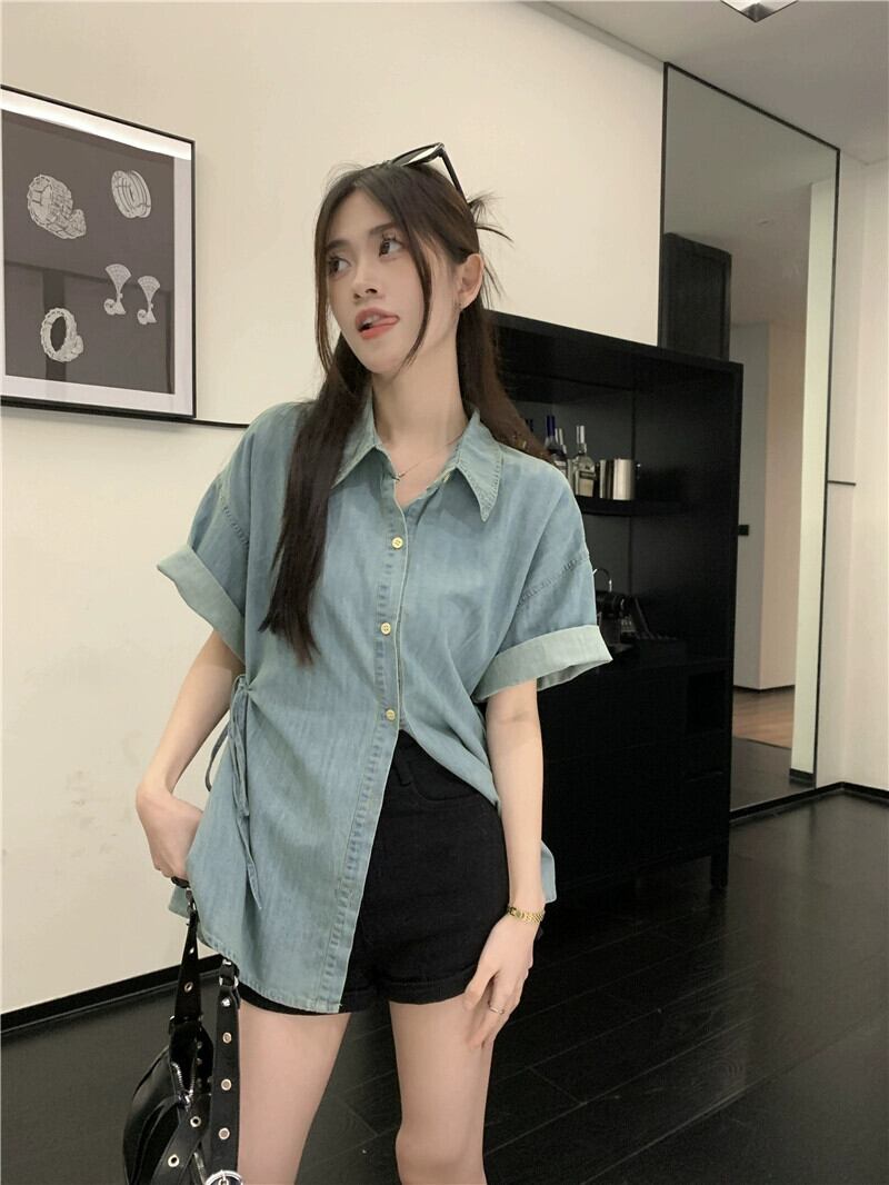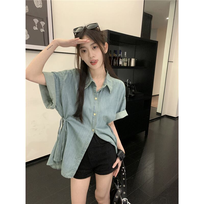 レトロデニムシャツジャケットレディース2023夏新作ルーズミッドレングスネクタイデザイン半袖トップ サマー 夏物 missk42492783865