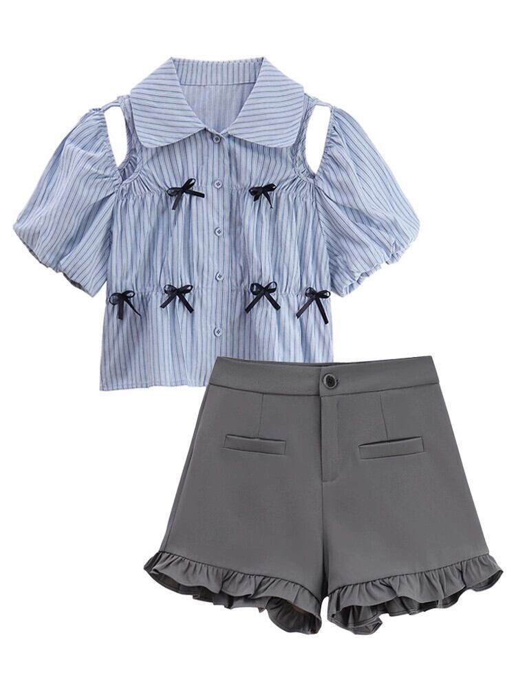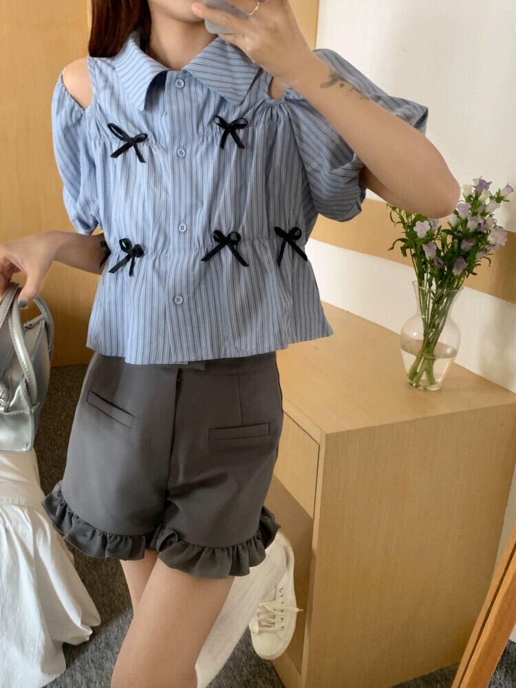 ストライプストラップレス半袖シャツ女性の夏の 2023 新しいフレンチデザインちょう結びショートシックなシャツ リボン サマー 夏物 missk81866892529