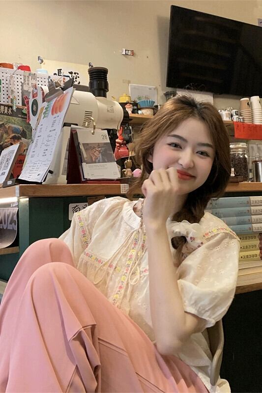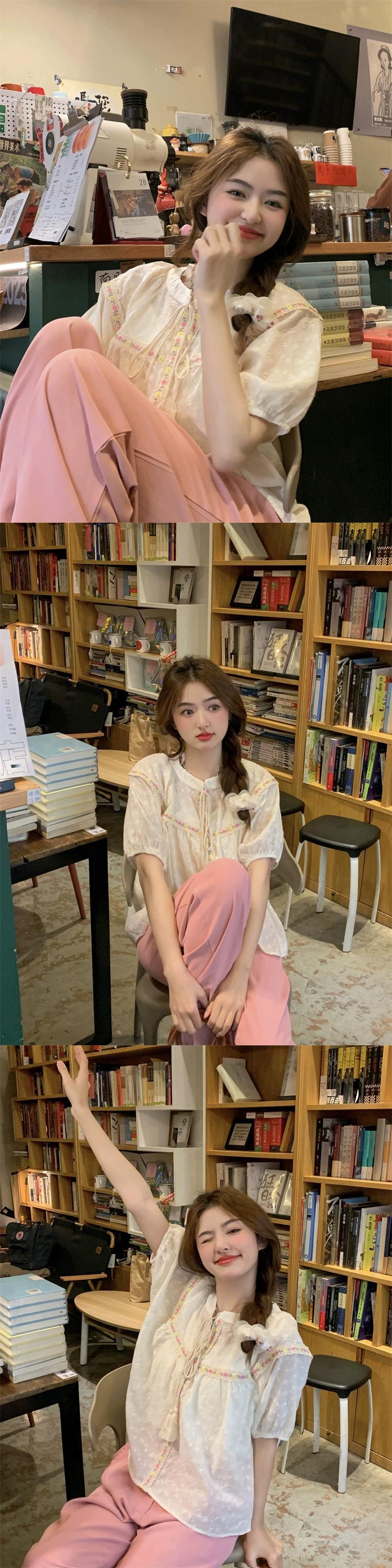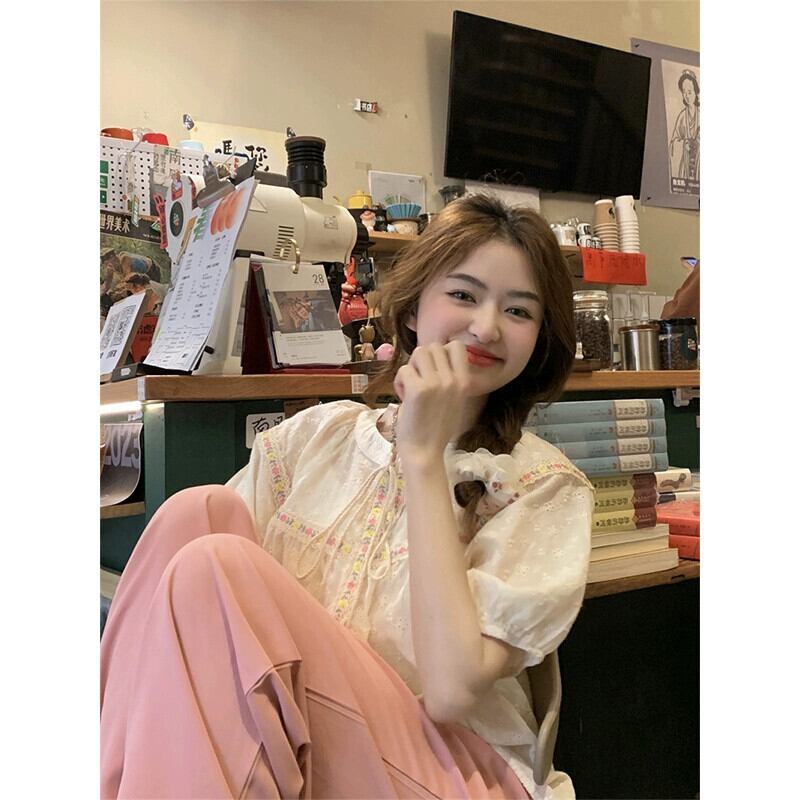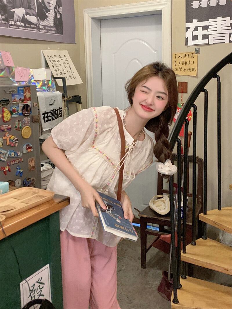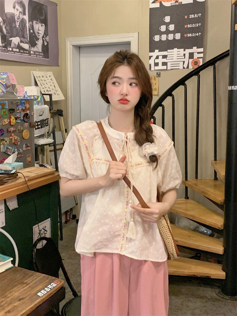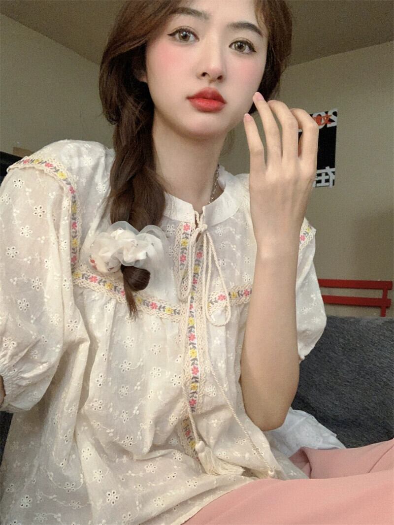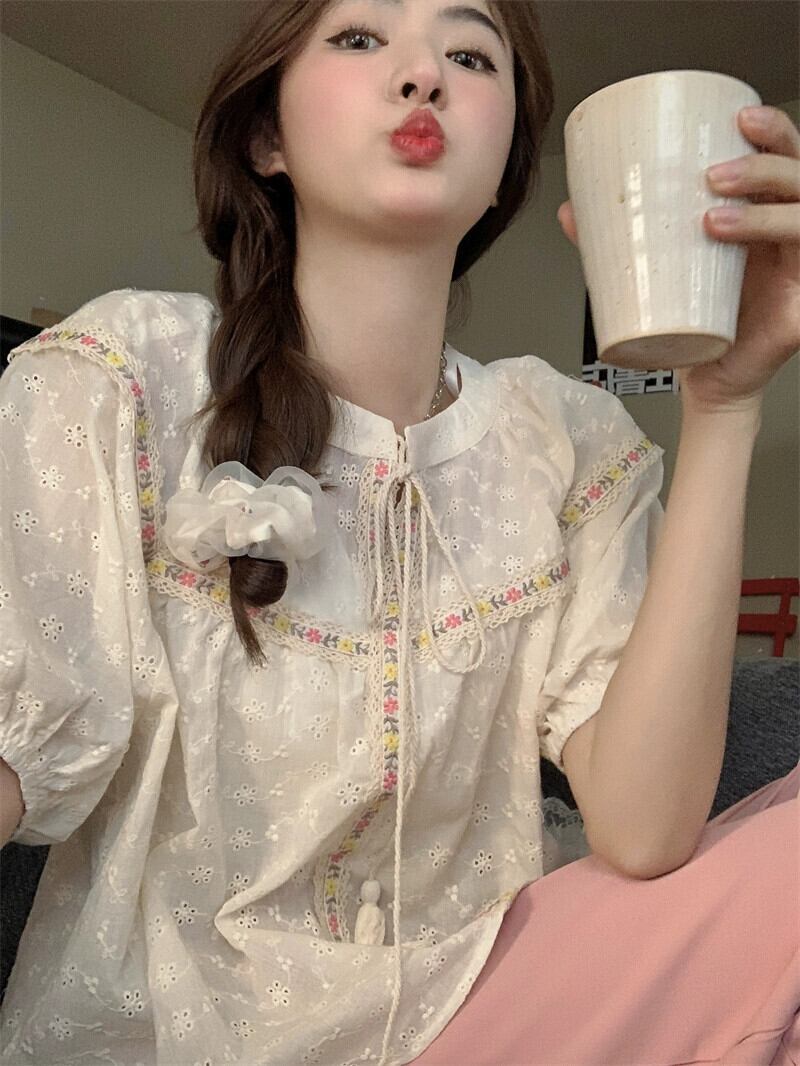 パフスリーブシャツレディース2023夏新作甘い重工業デザインセンス中空ネクタイ半袖トップ 大人ガーリー スウィート キュート カジュアル サマー 夏物 missk88402926444