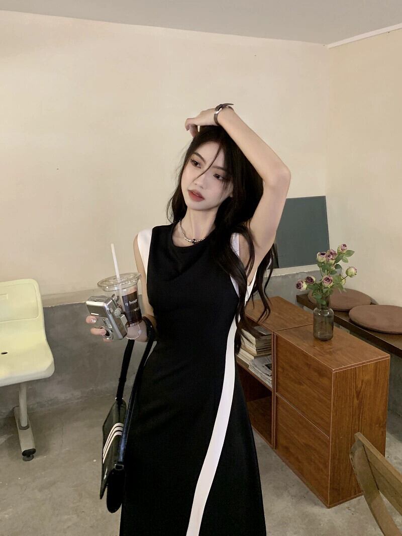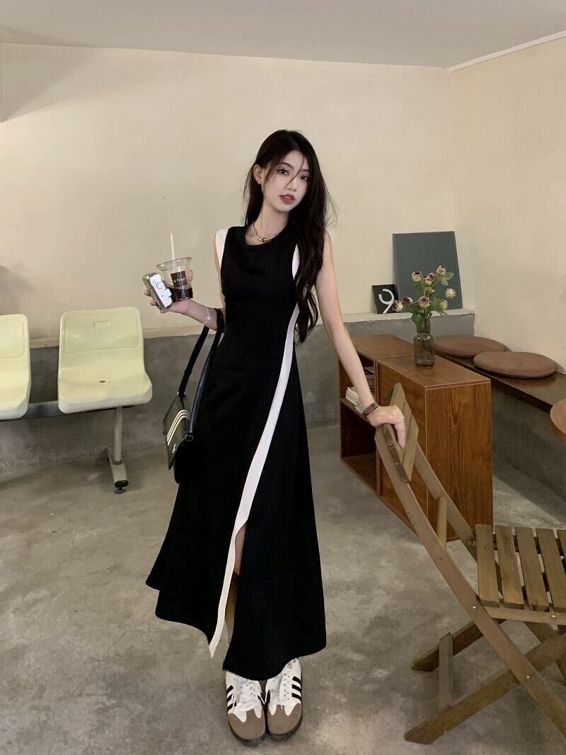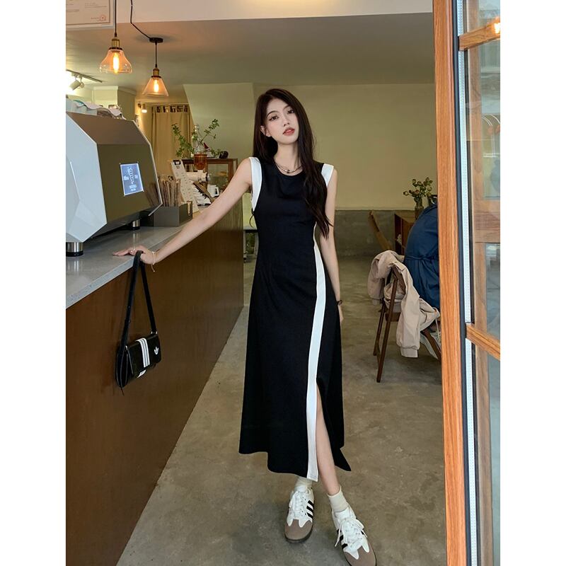 コントラストカラースプライシングベストドレス女性の夏の 2023 新しいウエスト痩身デザイン感覚スリットノースリーブロングスカート サマー 夏物 missk74145660670