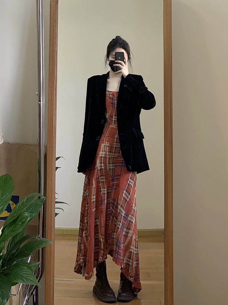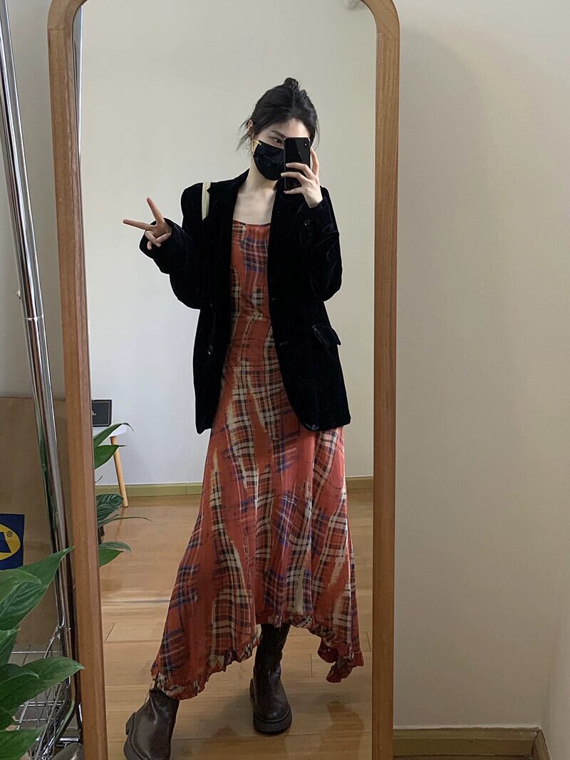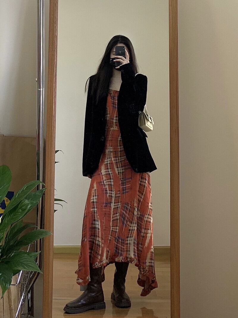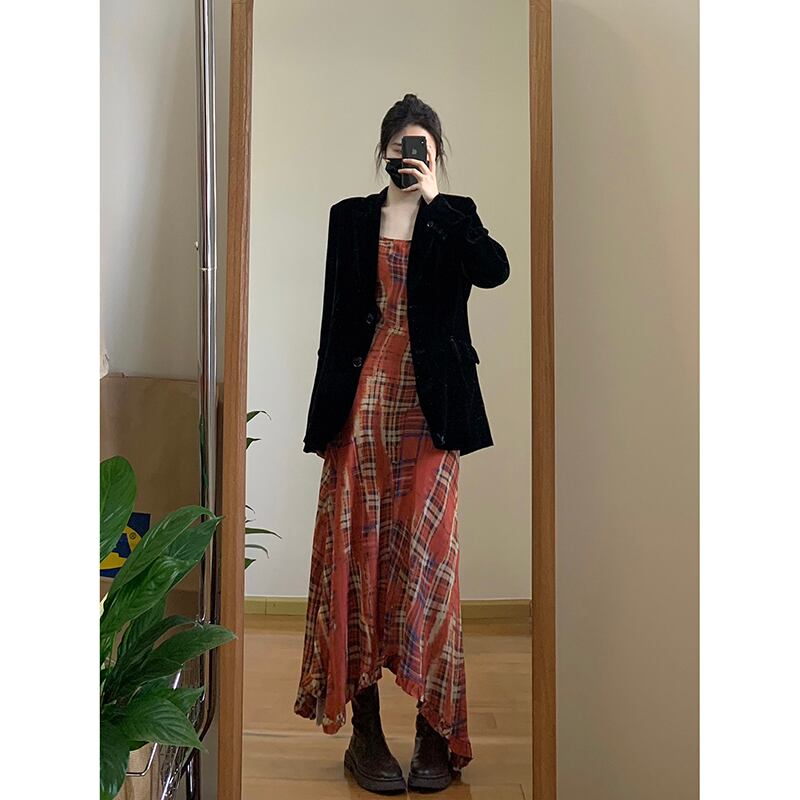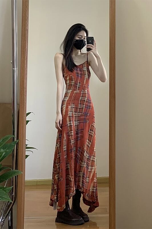 チェック柄サスペンダードレスの女性の夏の 2023 新しいフレンチレトロ不規則なウエスト痩身ロングスカート サマー 夏物 missk78451047477