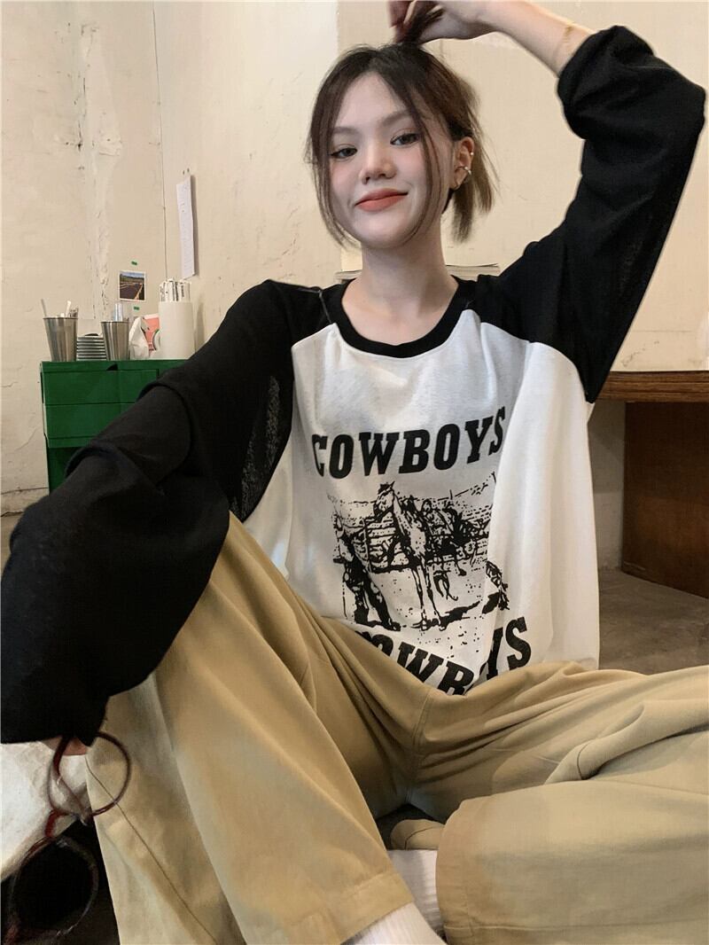 アメリカンレトロカラーコントラスト日焼け止め Tシャツ女性の夏の 2023 新しいルーズミッドレングスレタープリント長袖トップ ロング サマー 夏物 missk83908278154